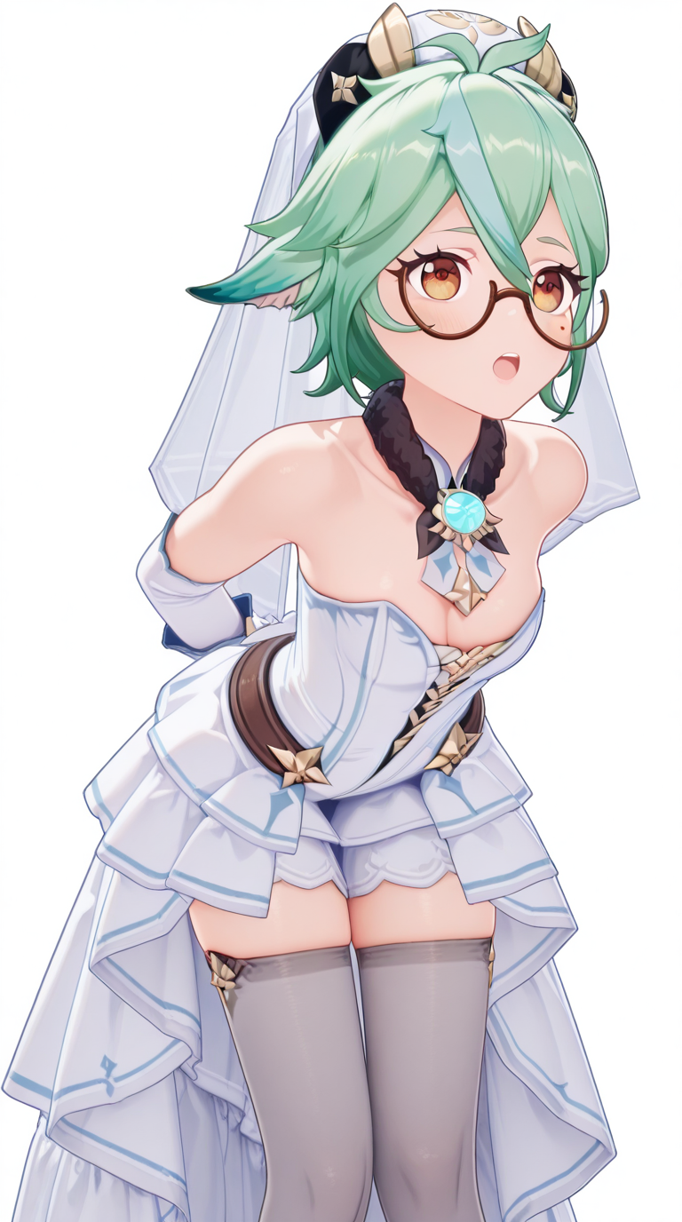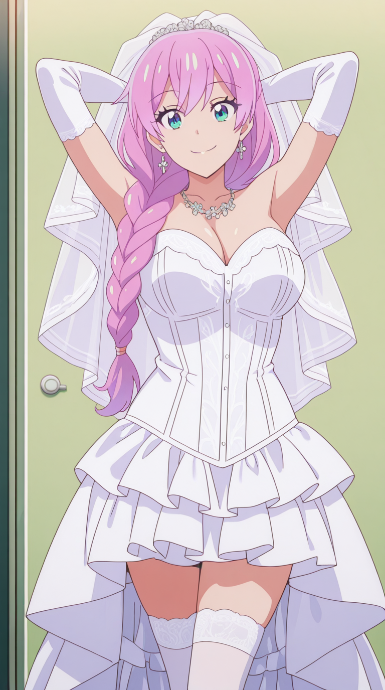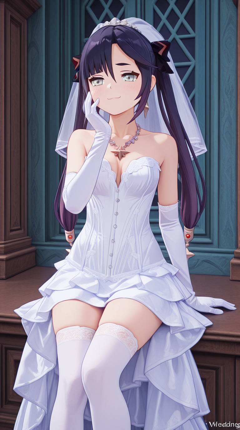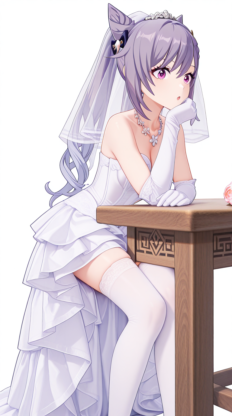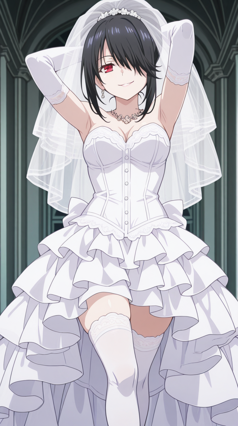 lora:high-low-wedding-dress-illustriousxl-lora-nochekaiser:1, high-lowweddingdress, gloves, dress, thighhighs, jewelry, bare shoulders, elbow gloves, necklace, white thighhighs, veil, wedding dress, bridal veil, bride