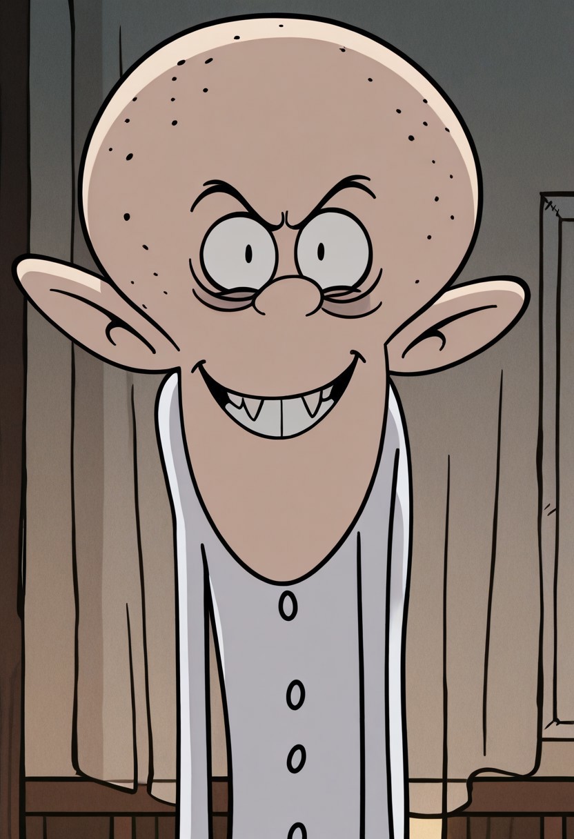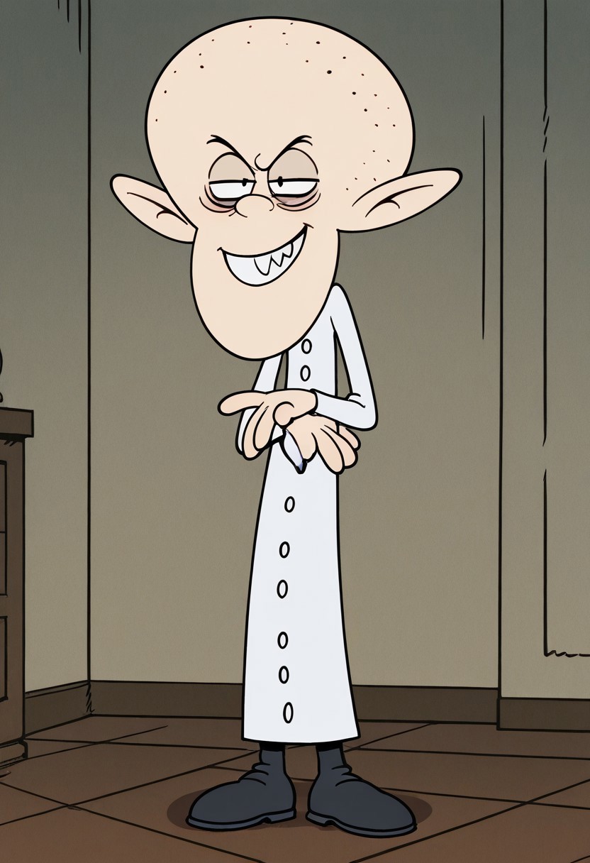 Prompt: Boris, solo, 1boy, tall, thin, bald, pale skin, big ears, vampire fangs, black eyes, eyebags, white apothecary robe, light gray boots