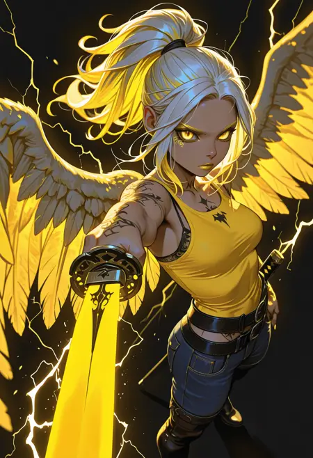 This second trigger words are : pointy ears, two tone hair, white hair, yellow hair, yellow eyes, makeup, yellow lipstick, yellow nails, right arm tattoo, back tattoo, wings, ponytail, yellow crop top, bra, jeans, waist belt, thigh boots,