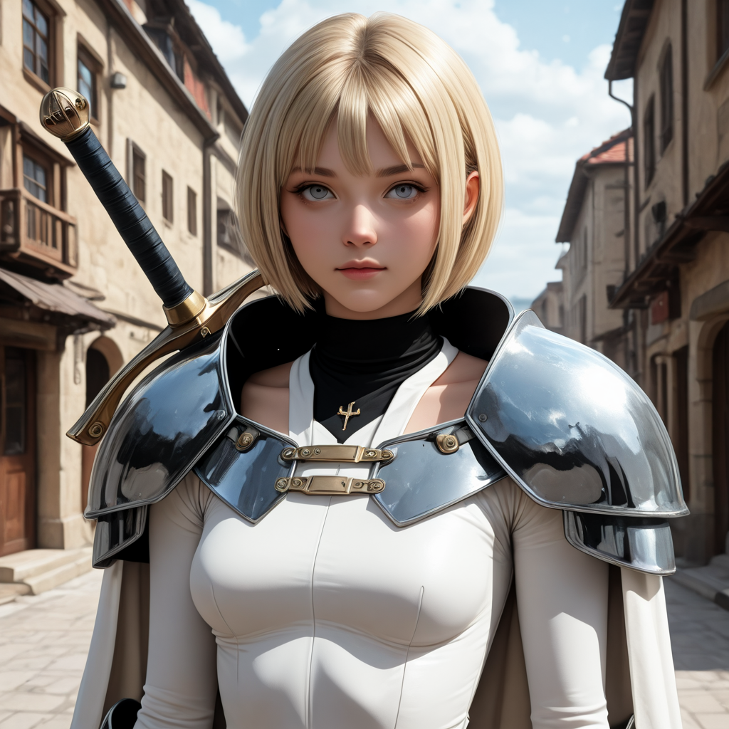 clarec, blond hair, short hair, grey eyes, white bodysuit, armor, pauldrons, white cape,