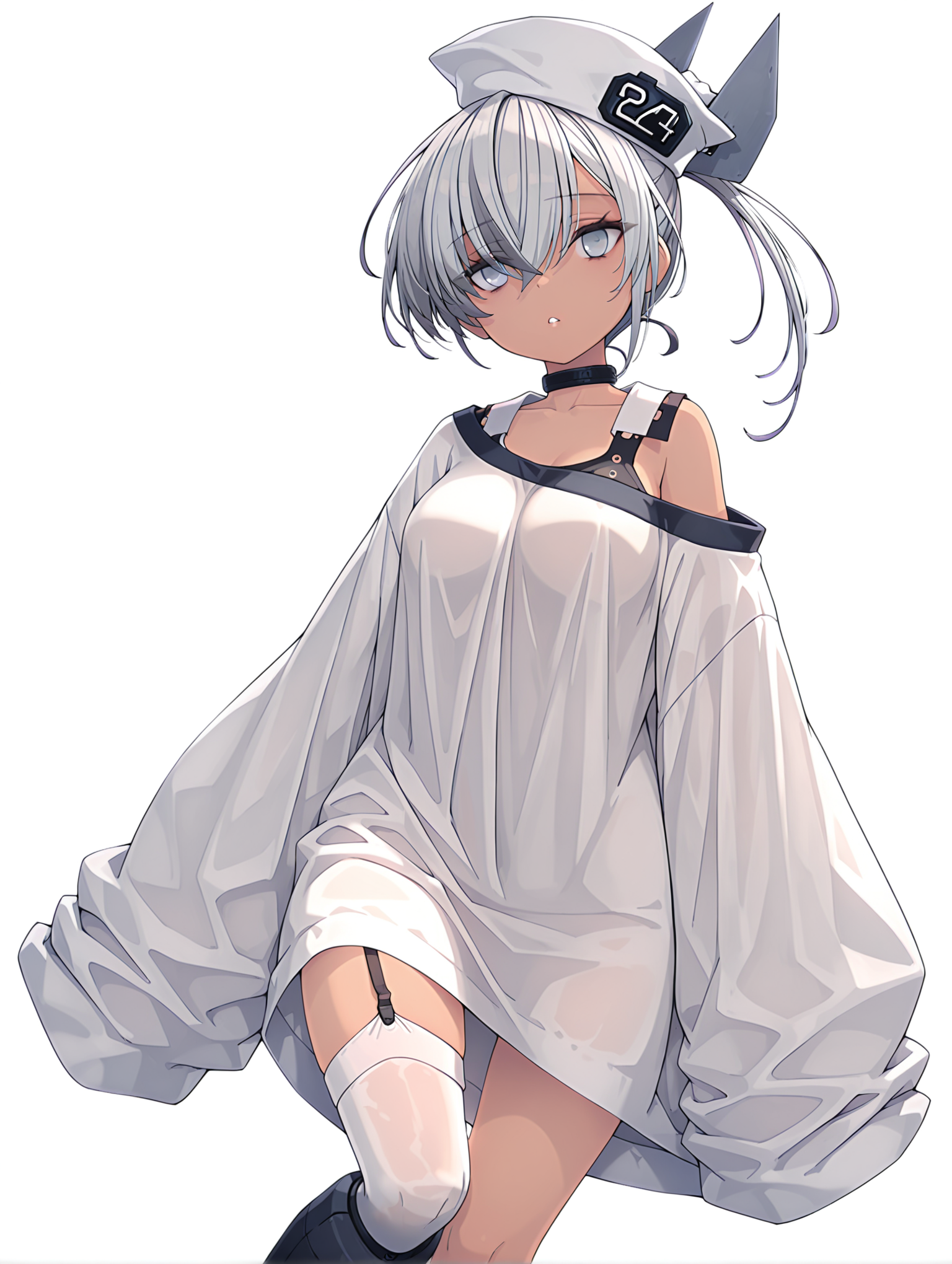 복장 ・d_clothes,white shirt,off shoulder,oversized clothes,sleeves past fingers,long sleeves,garter straps,white thighhighs,single kneehigh,mismatched legwear,black footwear,mechanical legs