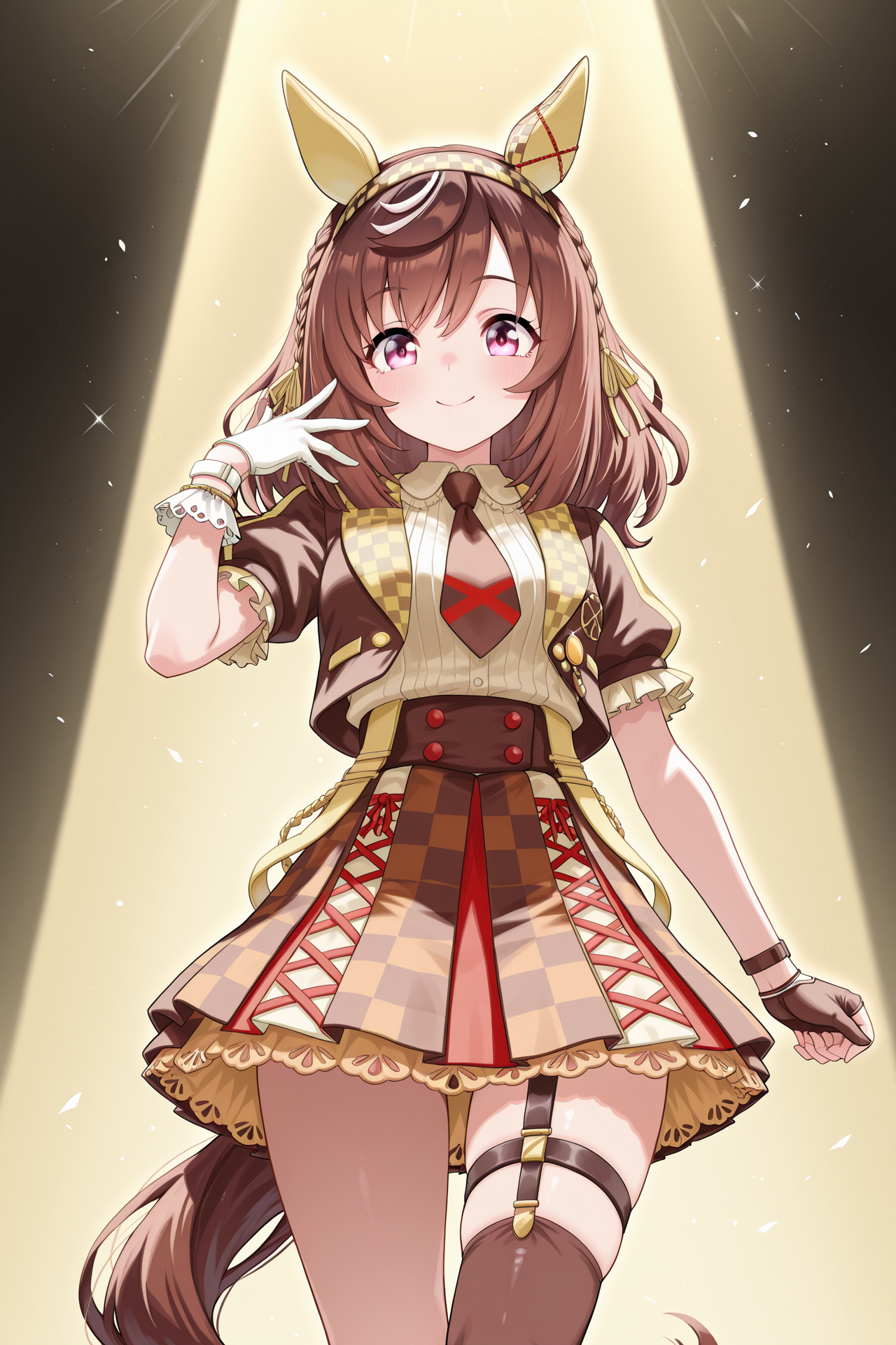 茶色のジャケット、開いたジャケット、白シャツ、短い袖、襟付きシャツ、茶色のネクタイ、非対称の手袋、白い手袋、茶色の手袋、茶色のスカート、多色のスカート、チェック柄のスカート、太ももストラップ、片側のタイツ、茶色のタイツ、非対称の脚衣、赤い靴、白い靴