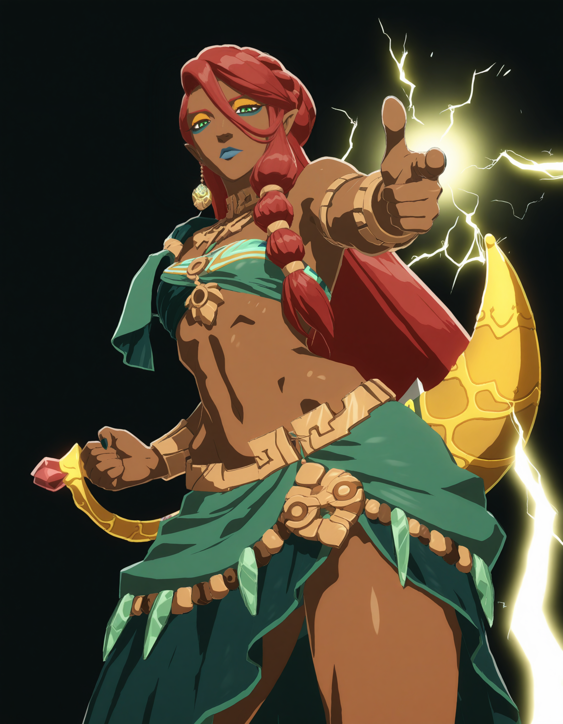 2rd1hw, 1girl, dark-skinned female, makeup, two-tone eyeshadow, side braid, low-tied long hair, hair tie,