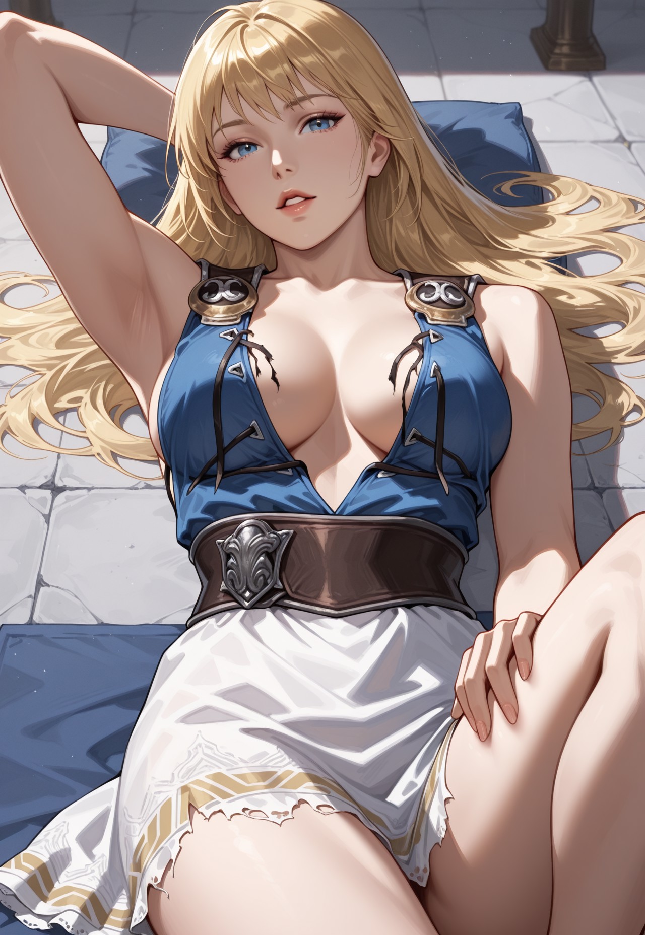 - 青いチュニック、ノースリーブ、交差リボン締め、ベルト、白いスカート、パウルドロン、バムブレース、サンダル、