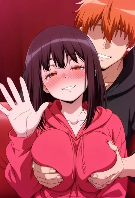 MEbukiTA, brown hair, amber eyes, mole by mouth, big breasts,