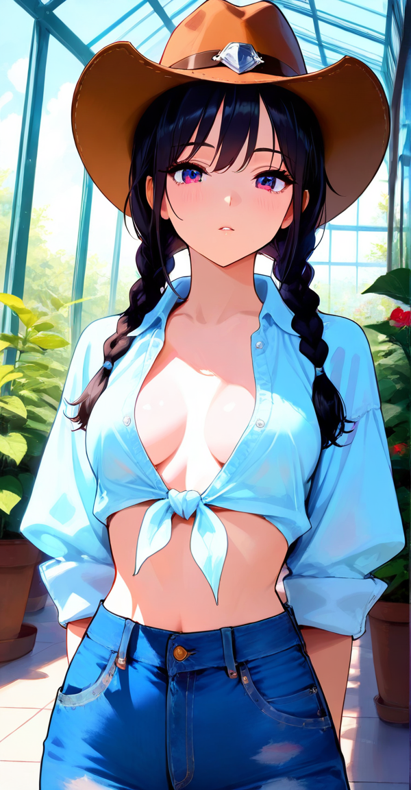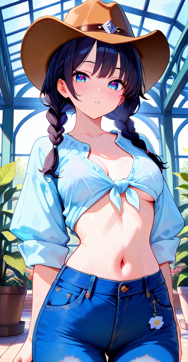 xg1, 1girl, denim, front-tie top, light blue tied shirt, underboob, jeans, cowboy hat, shirt sleeves rolled up, midriff