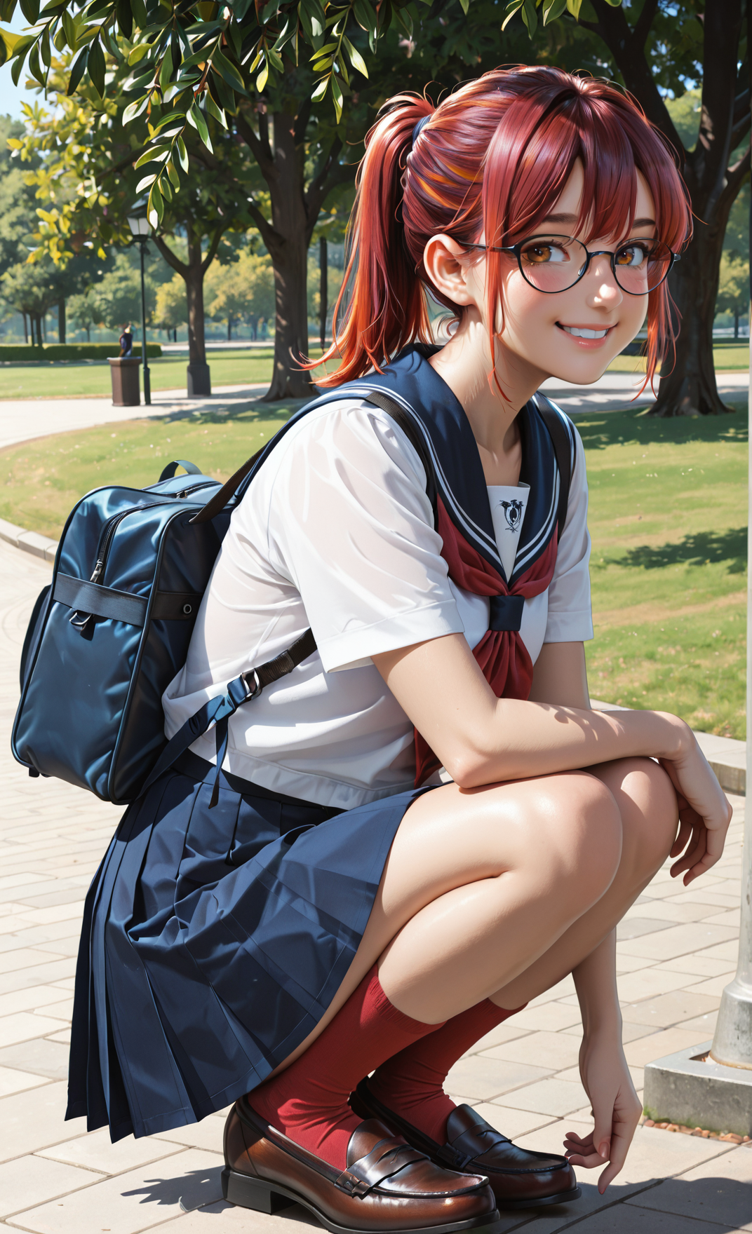 해적 칼라 셔츠, 빨간 넥커치프, 접힌 스커트, 검은 양말, 로퍼