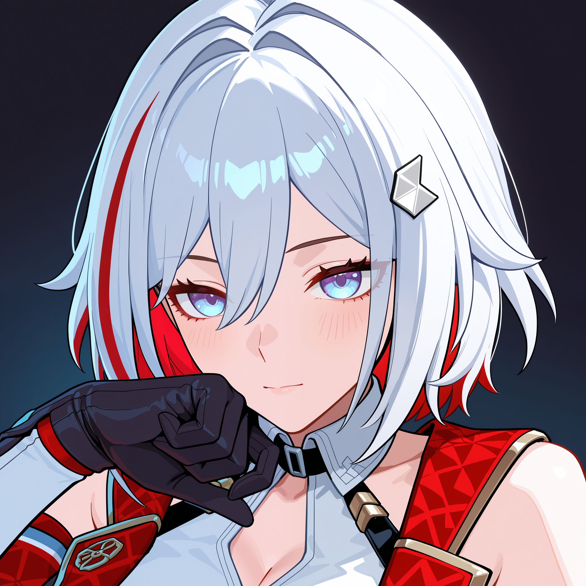 외모: 1소녀, 큰 가슴, 단발, 흰색 머리, 눈 사이의 머리카락, 머리카락이 얼굴을 가림, 안쪽 머리카락에 색상이 있음, 줄무늬 머리카락, 빨간 머리카락, 머리 장식, 머리핀
