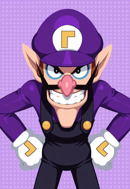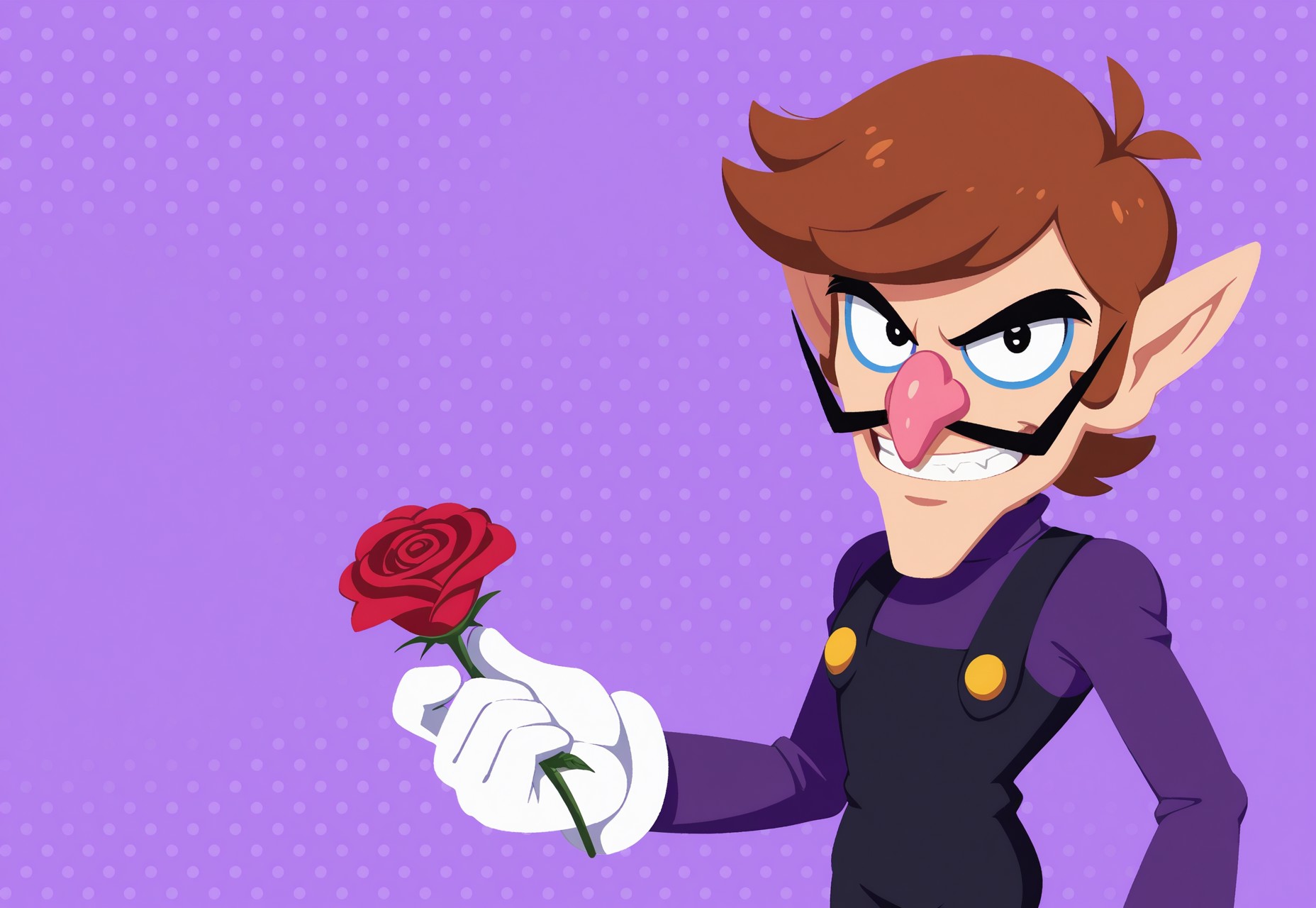 Waluigi, pink nose, mustache, brown hair, pointy ears, tall, lanky, purple headwear, purple shirt, black overalls, white gloves, brown shoes, pointy shoes