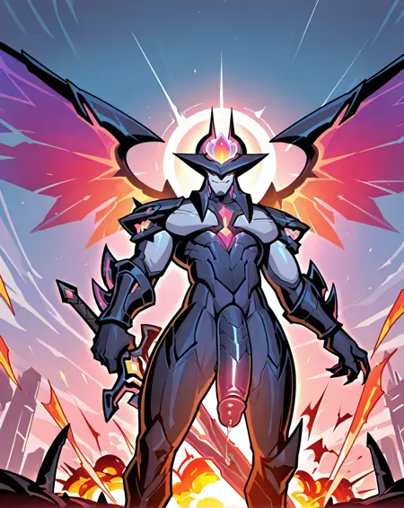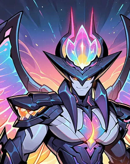 aatroxprim, 单人, 看着观众, 微笑, 1个男孩, 嘴闭着, 上半身, 黄色眼睛, 粉色头发, 男性焦点, 多色头发, 角, 牙齿, 翅膀, 艺术家名称, 护甲, 橙色眼睛, 肌肉发达, 有色皮肤, 发光, 肌肉男性, 锋利牙齿, 肩部护甲, 发光眼睛, 有色巩膜, 蓝色皮肤, 多色背景, 灰色皮肤, 发光头发, 户外