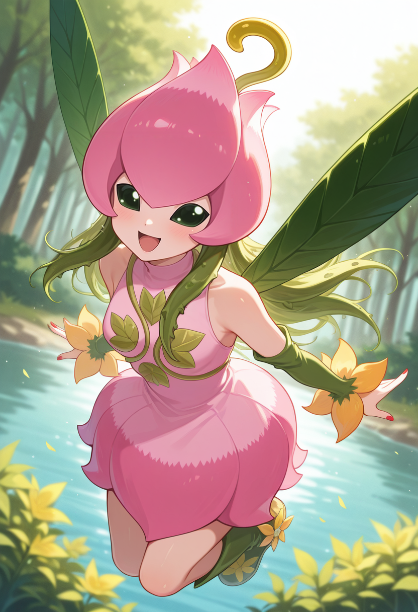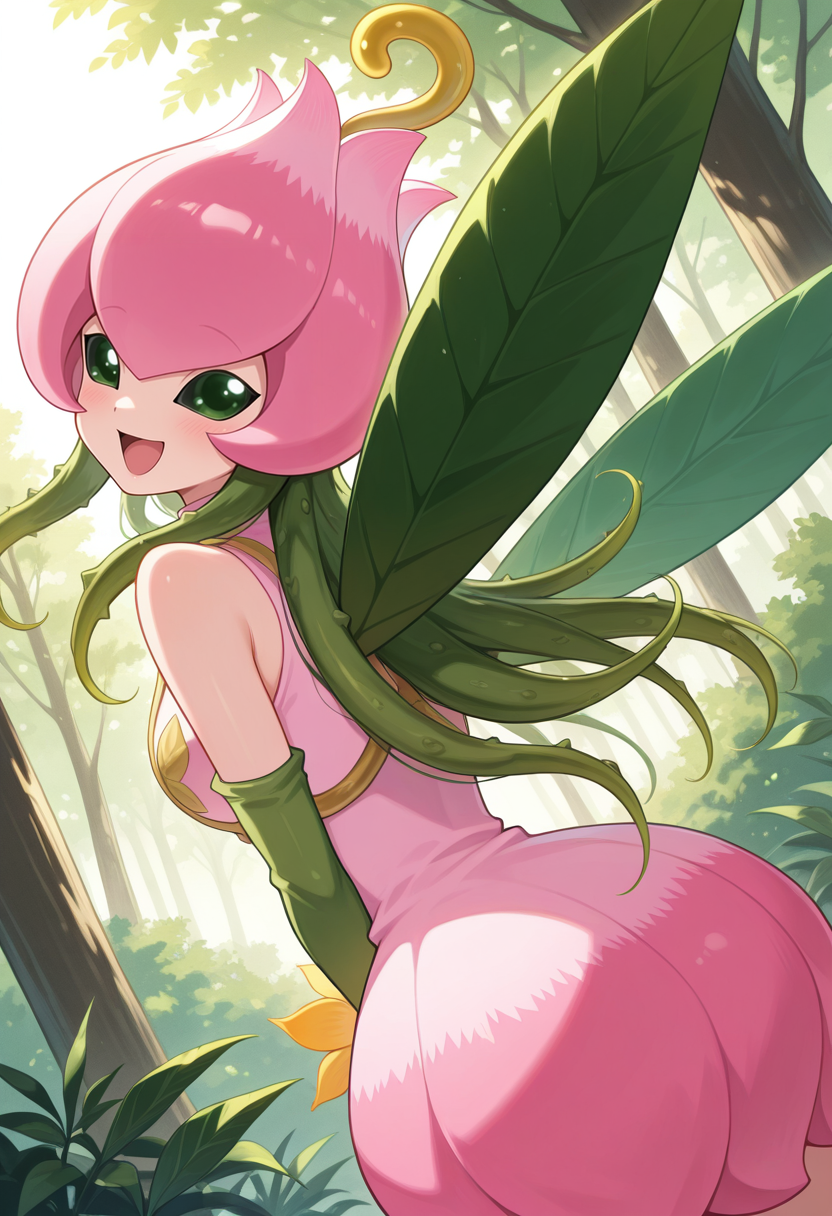 dglili, pink hair, green hair, long hair, green eyes, digimon \(creature\), plant hair, flower-shaped hair, sidelocks,