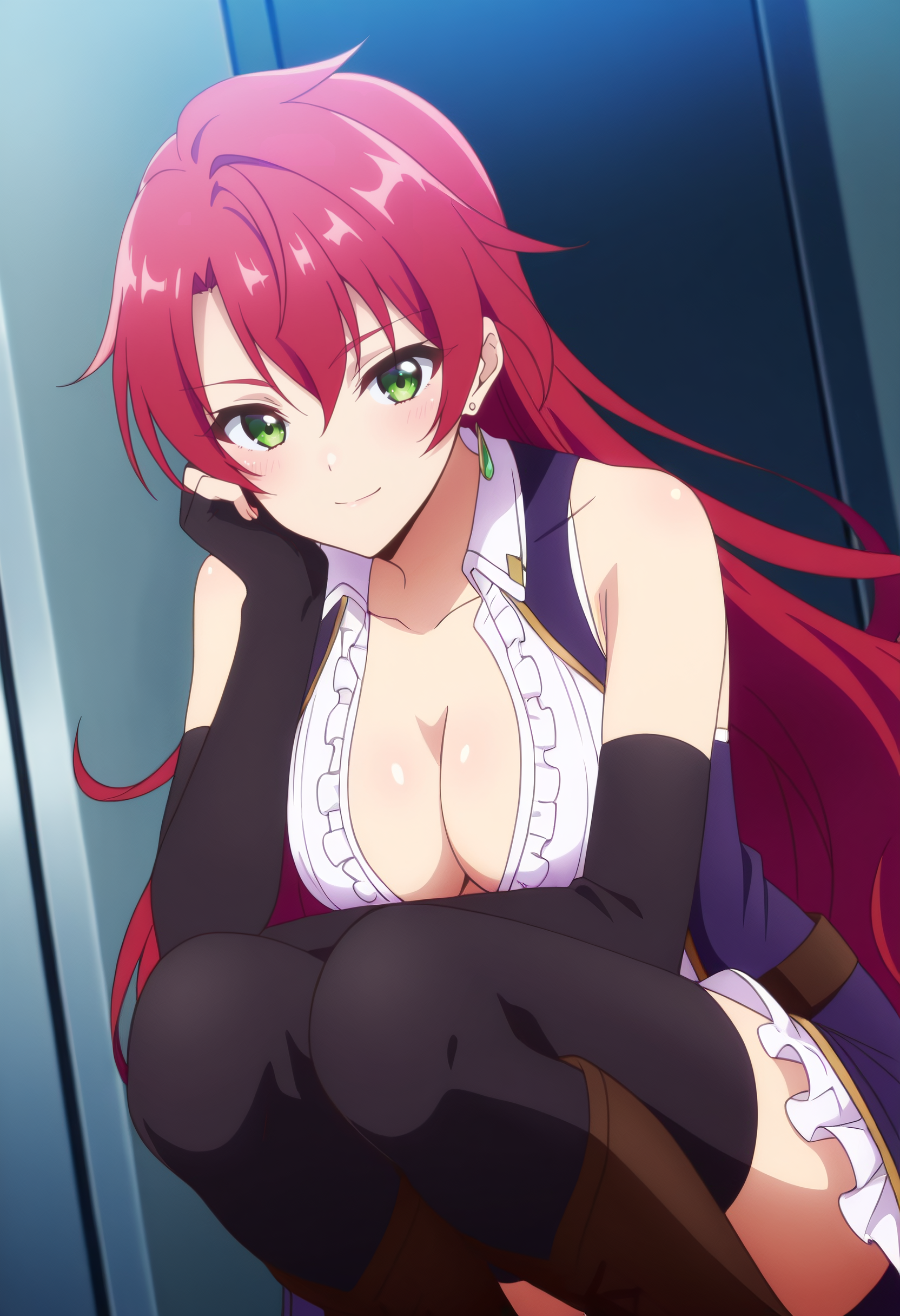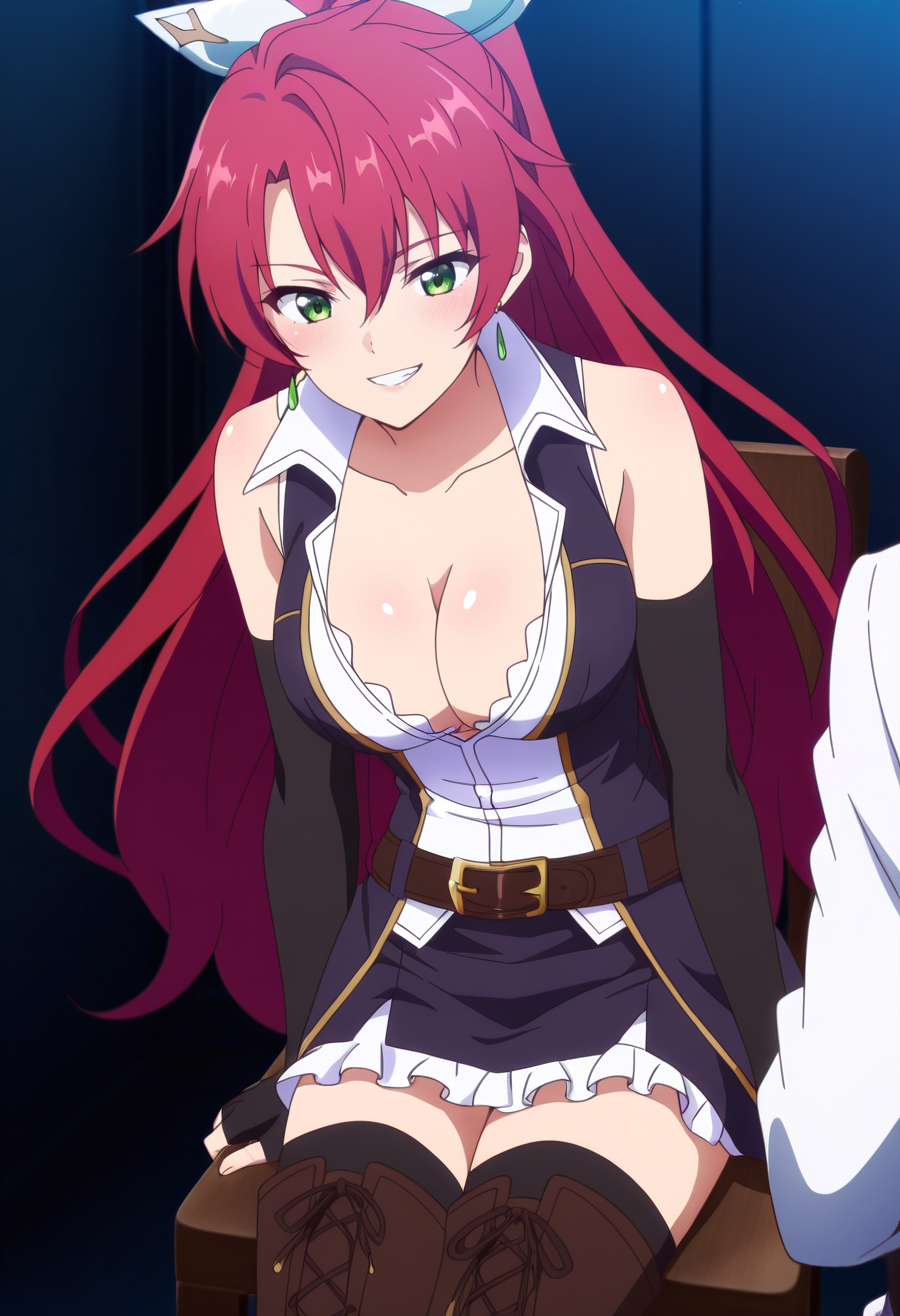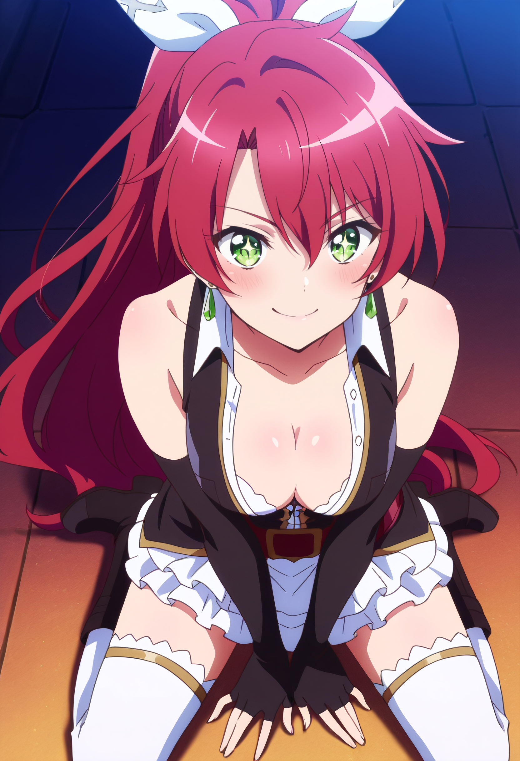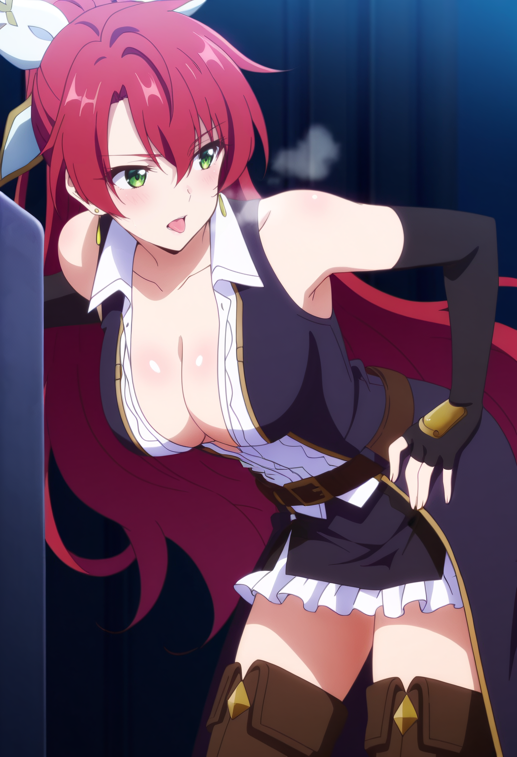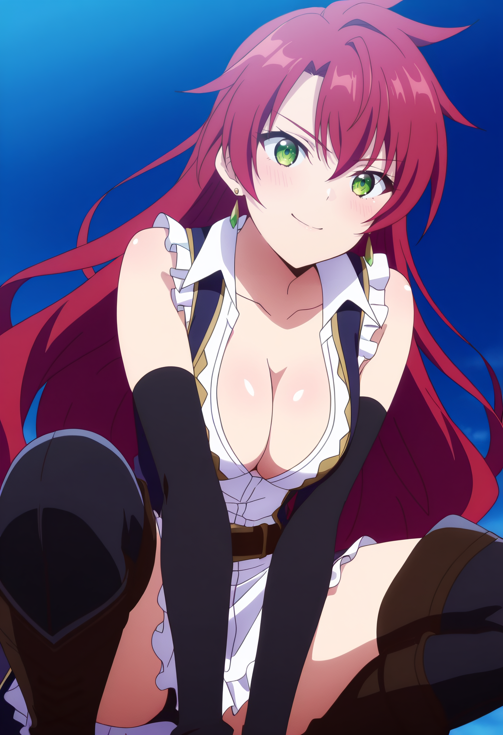 JeanneCleavage、手袋、肘まである手袋、鎖骨、裸の肩、胸元、ノースリーブ、イヤリング、ジュエリー、黒い手袋、シャツ、太ももまでの靴下、ドレス、開いた服、ブーツ、指なし手袋、開いたシャツ、衿付きシャツ、フリル、白いシャツ