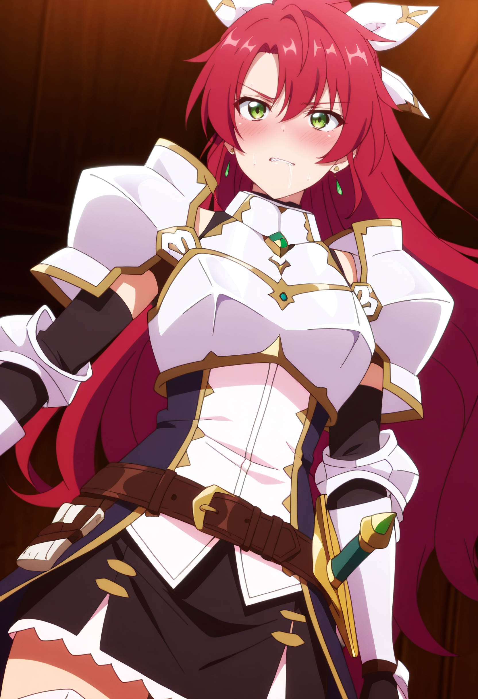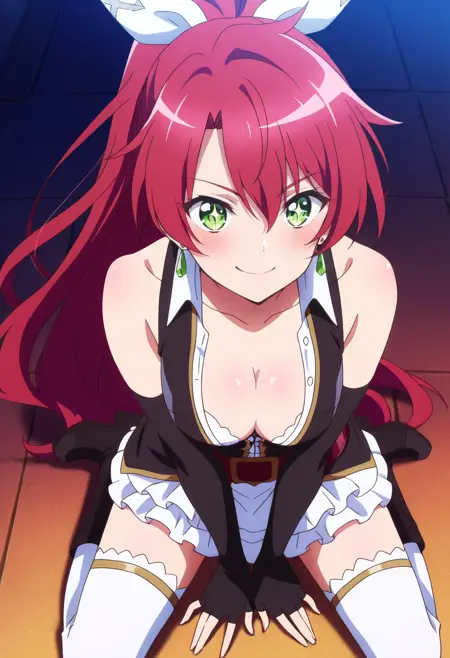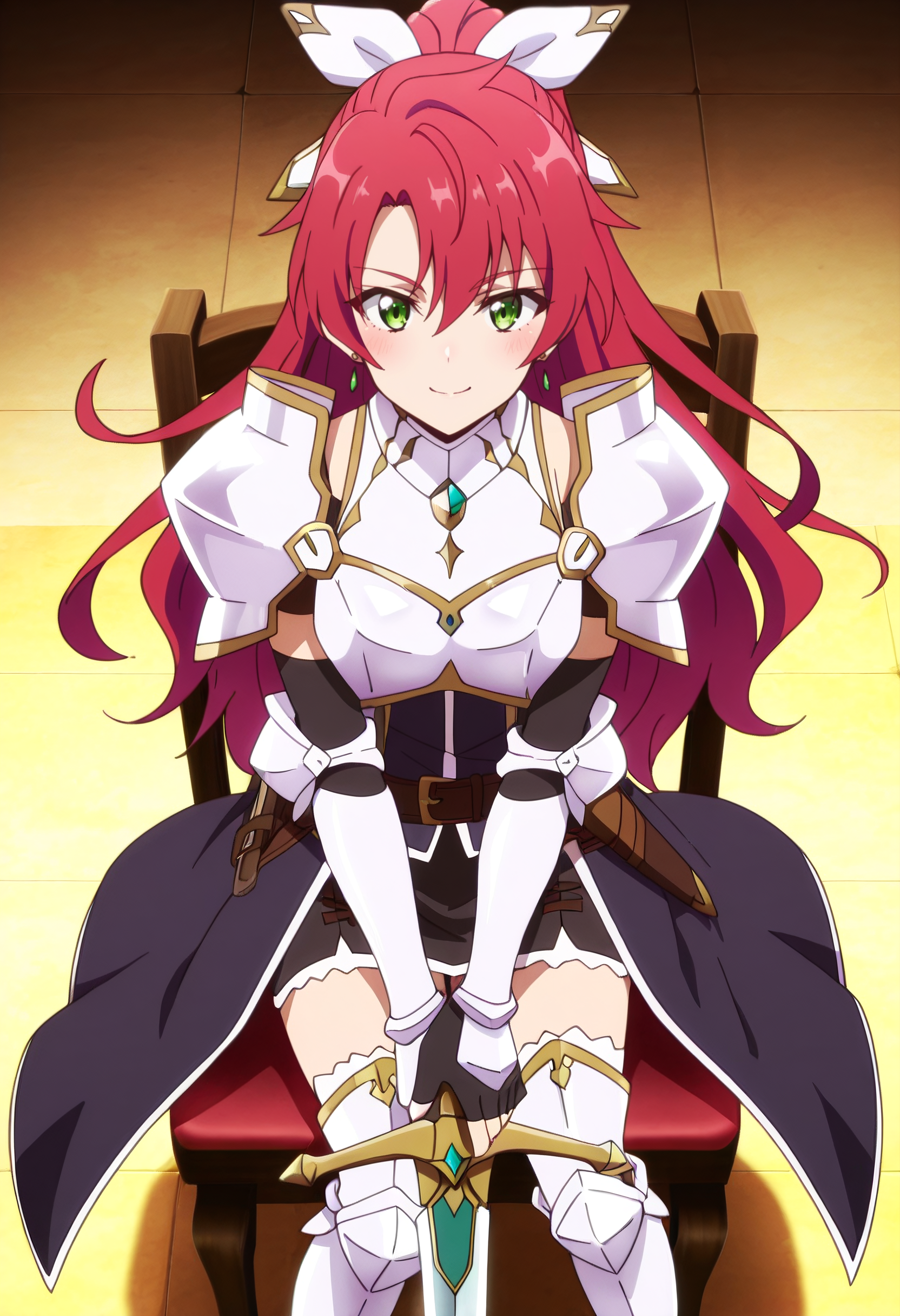 JeanneArmor、鎧、ジュエリー、イヤリング、手袋、リボン、髪のリボン、 bow、肩の鎧、胸当て、太ももまでの靴下、ドレス、髪のbow、指なし手袋、肘まである手袋、スカート、ガントレット、ベルト、ブーツ、白いリボン、黒い手袋、黒いスカート、パウルドロン