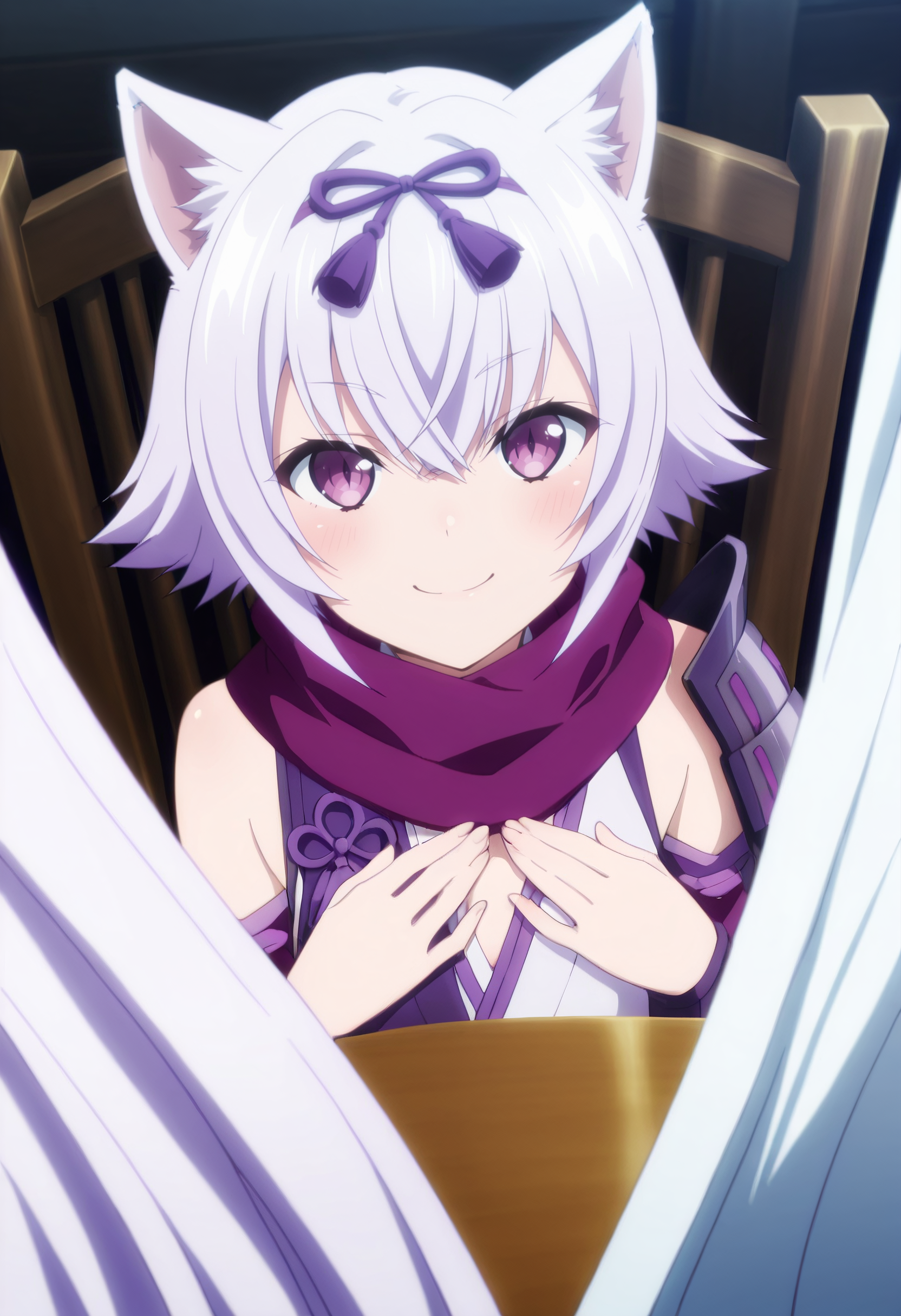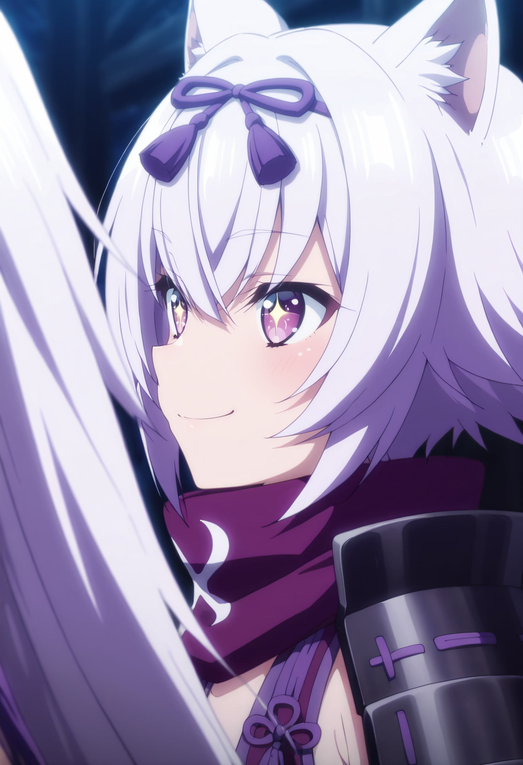 髪飾り、リボン、スカーフ、肩アーマー、紫のスカーフ、紫のリボン