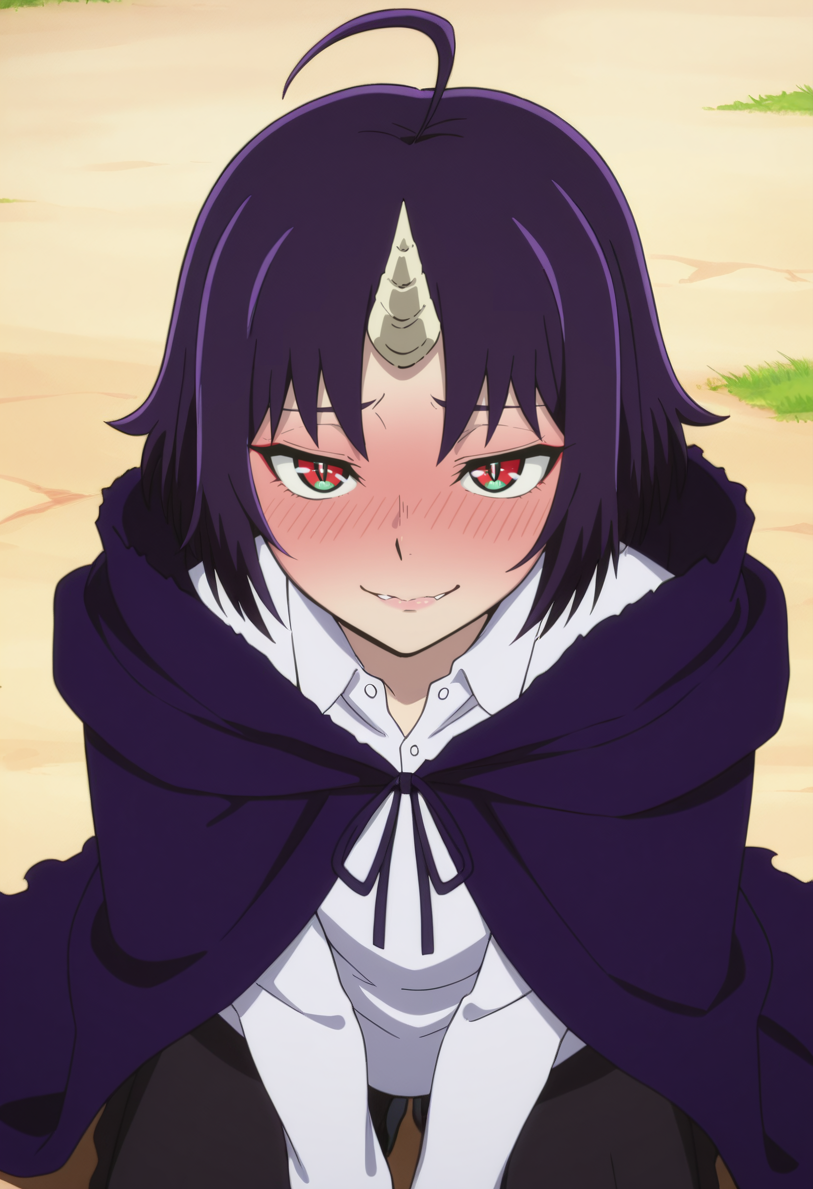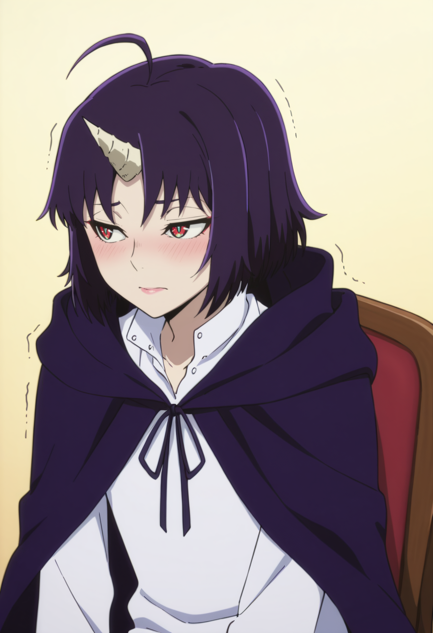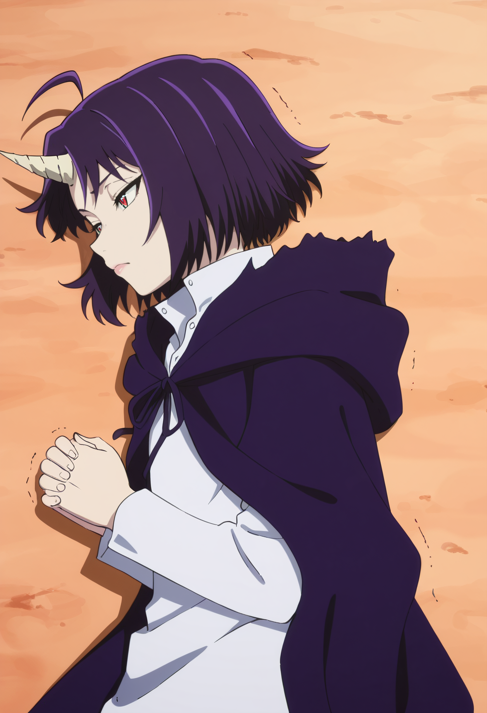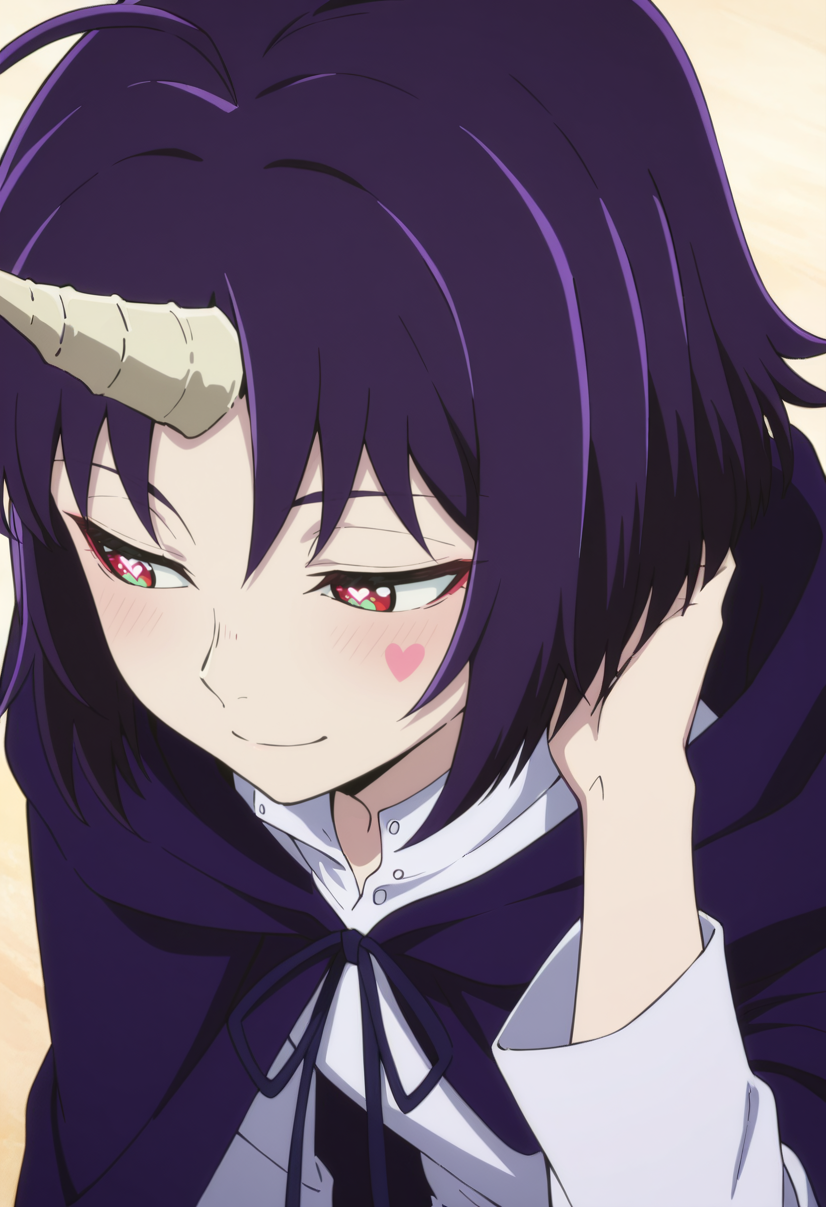 CleKlen、1boy、短髪、紫髪、赤い目、前髪、あほ毛、中性的、角、片角