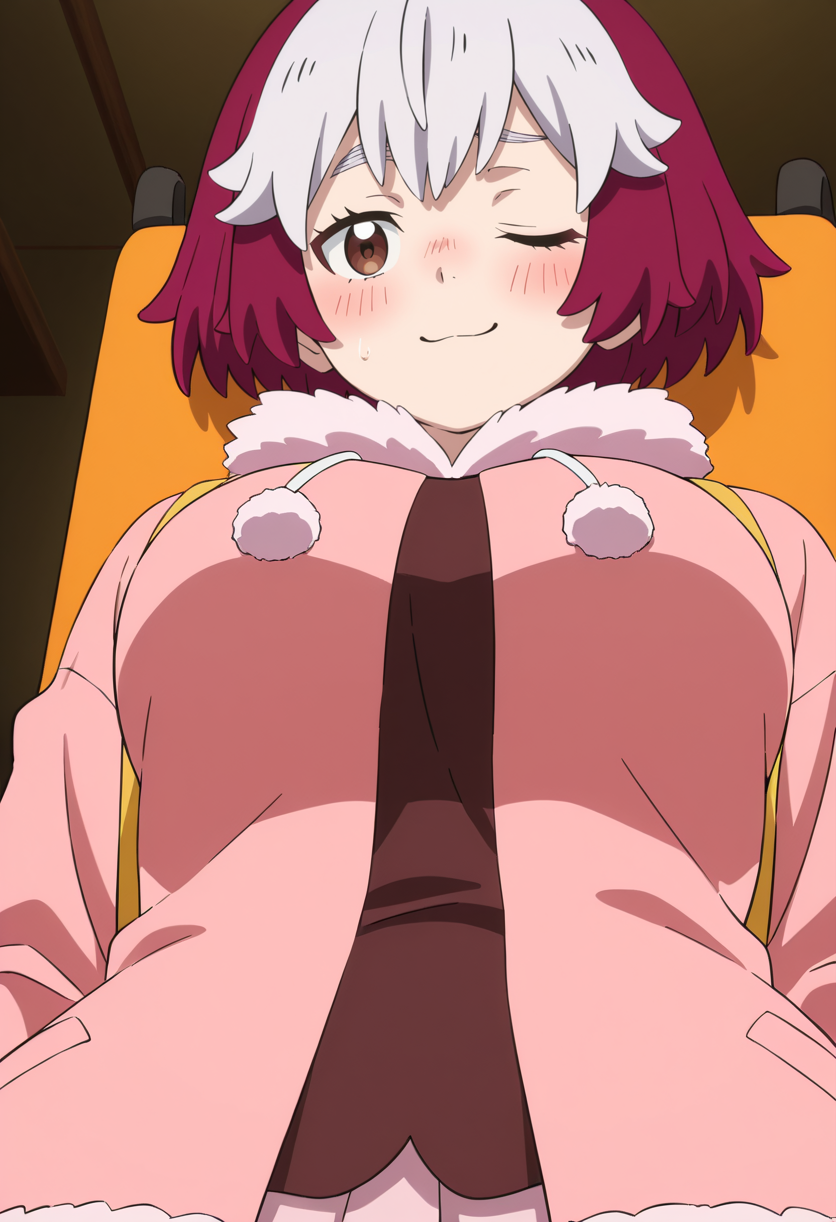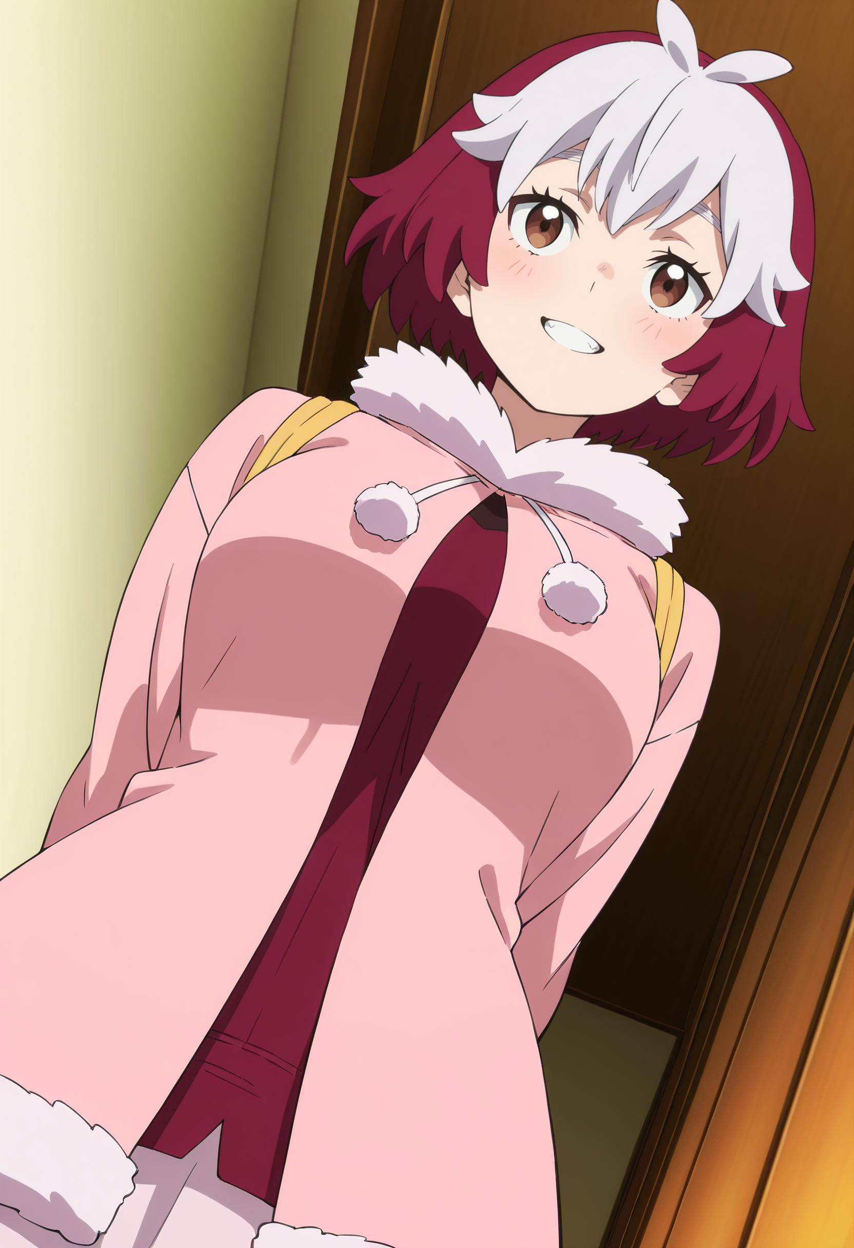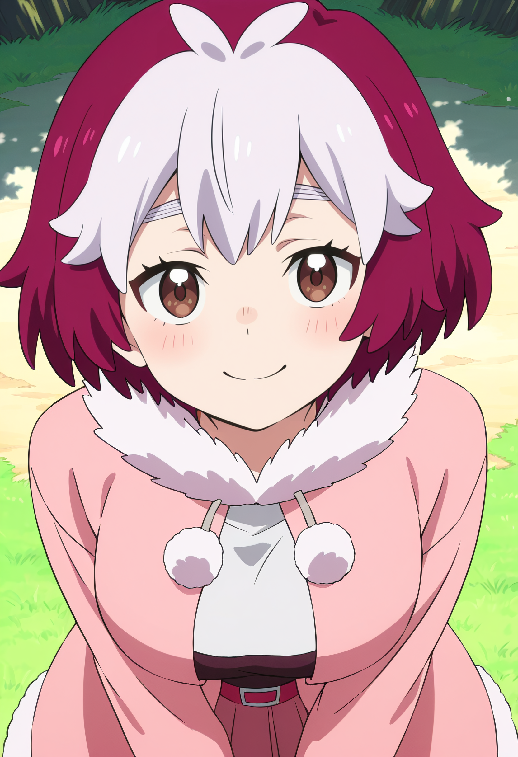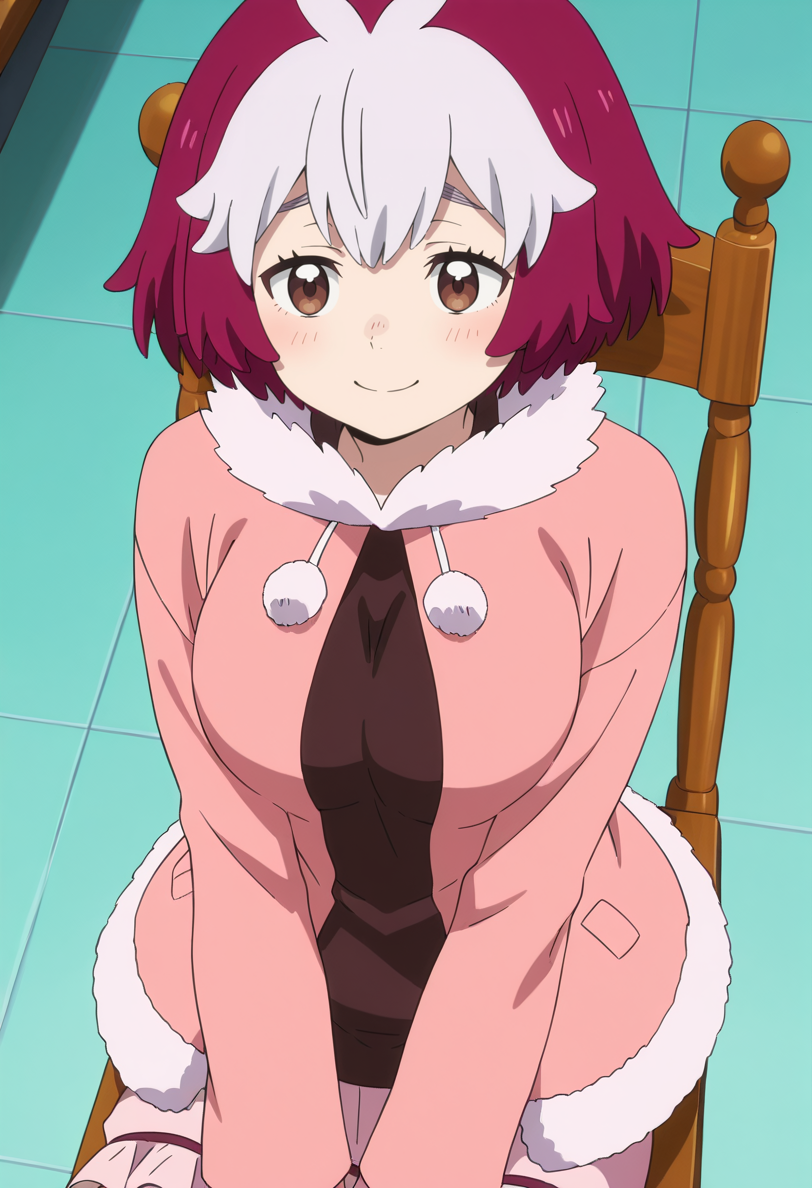 NelluruShortHair, short hair, multicolored hair, white hair, two-tone hair, purple hair, fur trim, fur collar, fur-trimmed sleeves, fur-trimmed jacket, long sleeves, coat, shirt, jacket, pink jacket, pink skirt, frills, skirt,