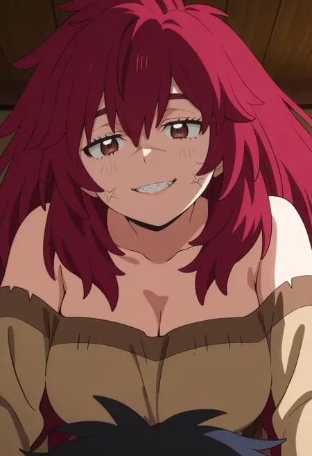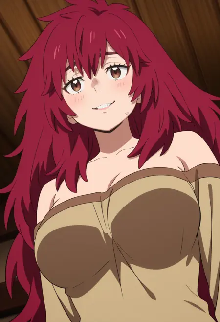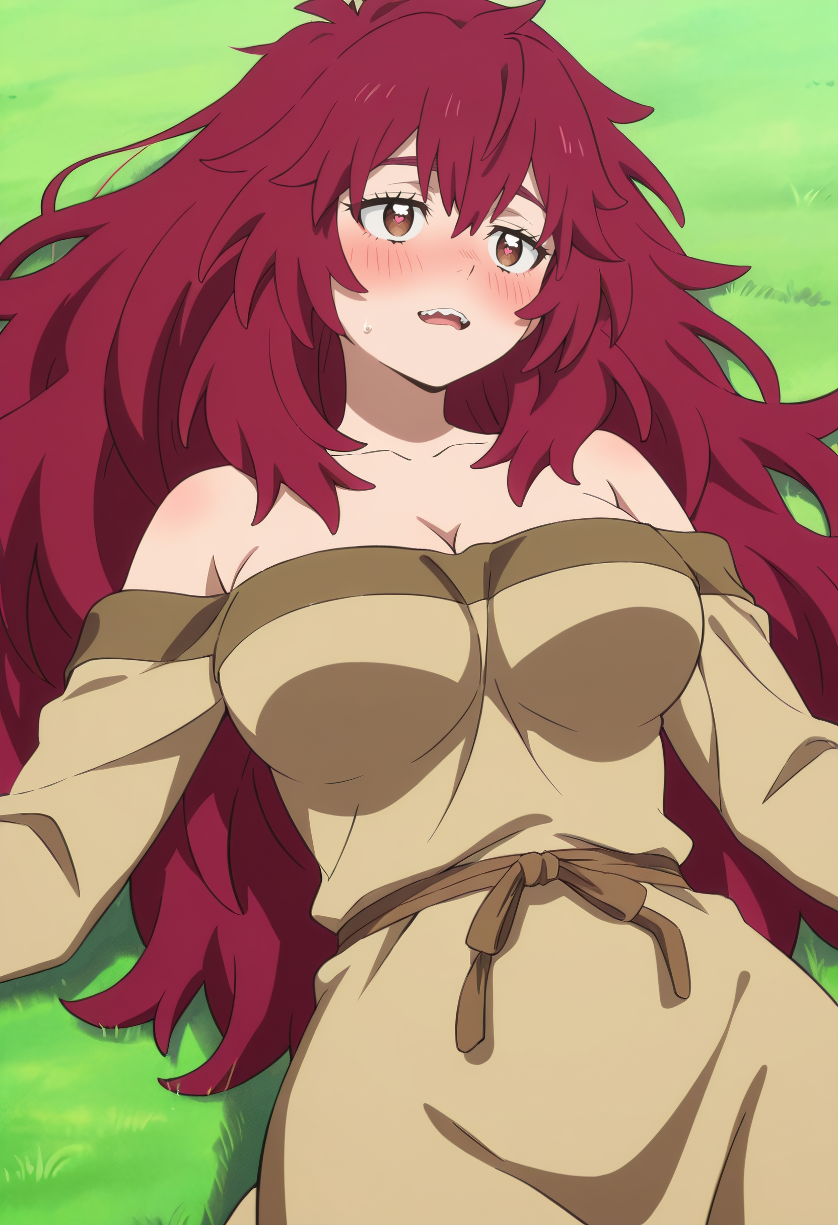 NelluruLongHair, messy hair, long hair, hair between eyes, collarbone, spiked hair, cleavage, bare shoulders, shirt, sharp teeth, skirt, brown skirt, brown shirt,