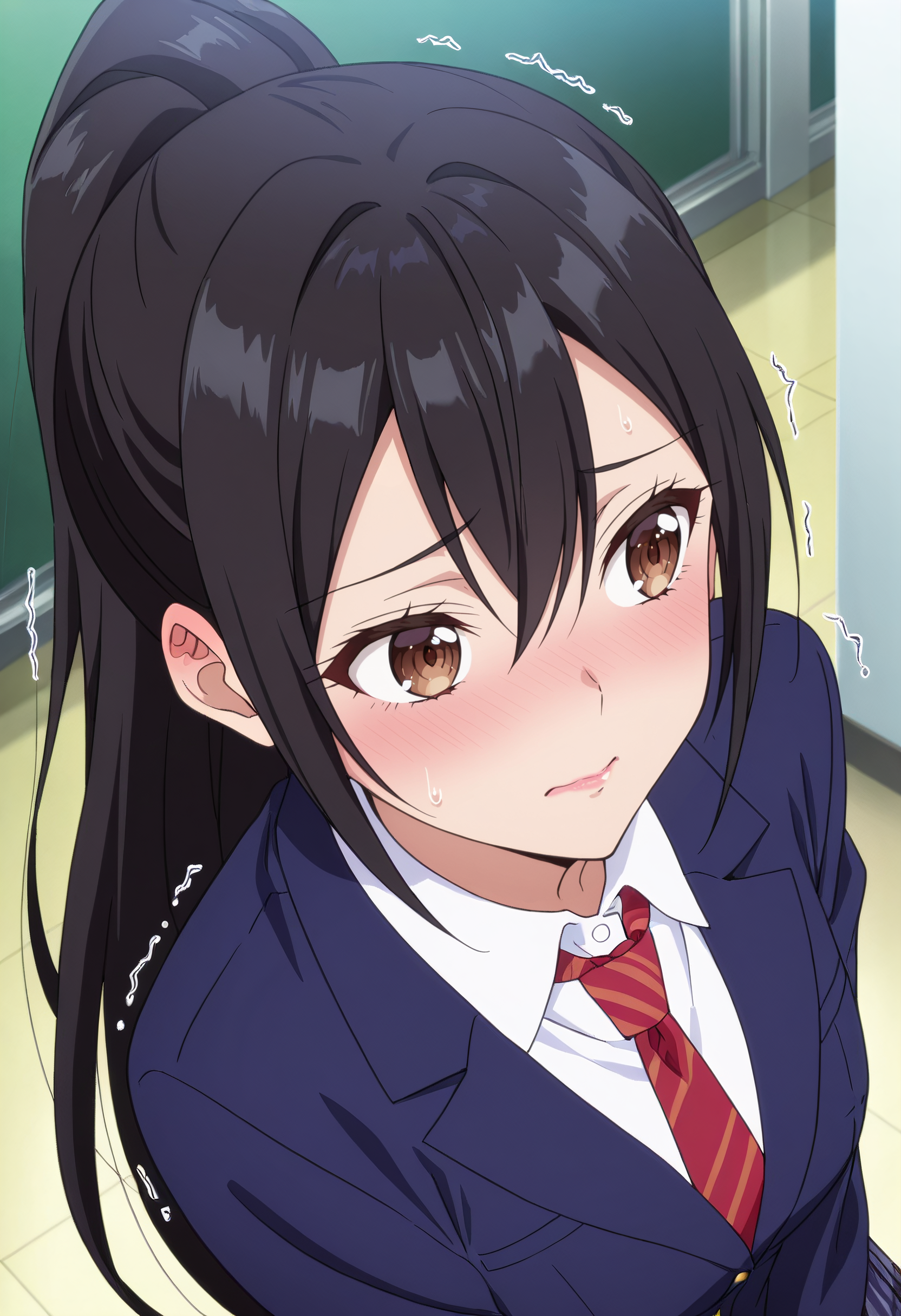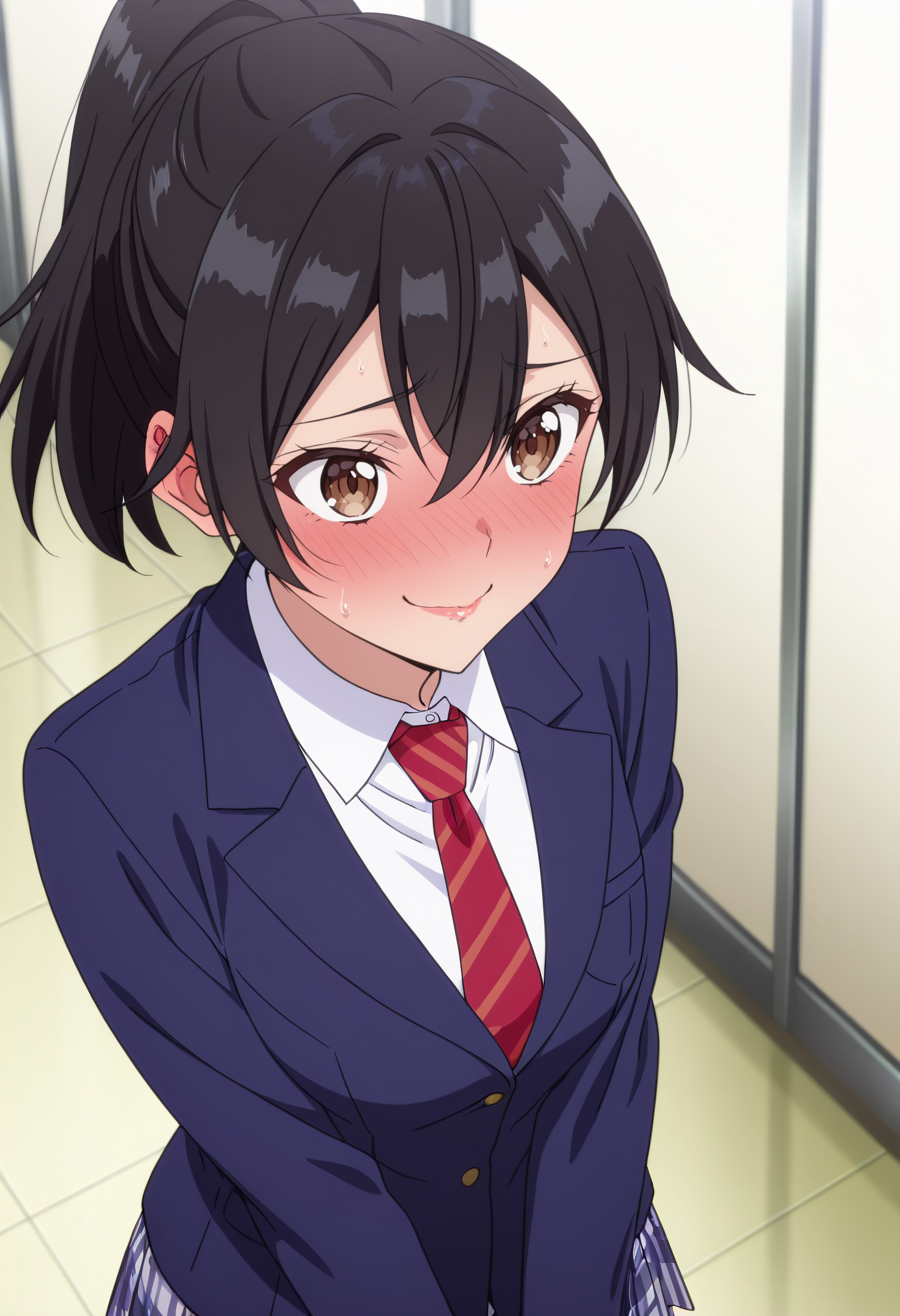 학교 유니폼, 셔츠, 흰 셔츠, 칼라 셔츠, 넥타이, 빨간 넥타이, 줄무늬 넥타이, 줄무늬, 짧은 소매, 재킷, 치마, 대각선 줄무늬, 체크무늬, 체크 치마, 블레이저, 긴 소매, 체크 넥타이, 주름 치마, 파란 재킷, 벌어진 재킷,