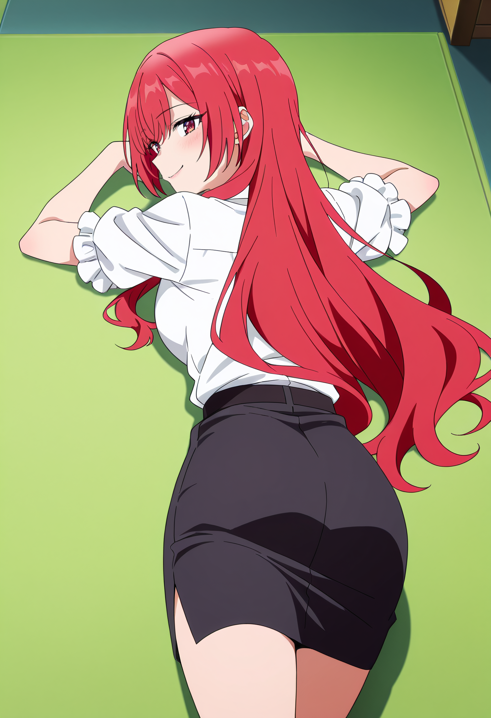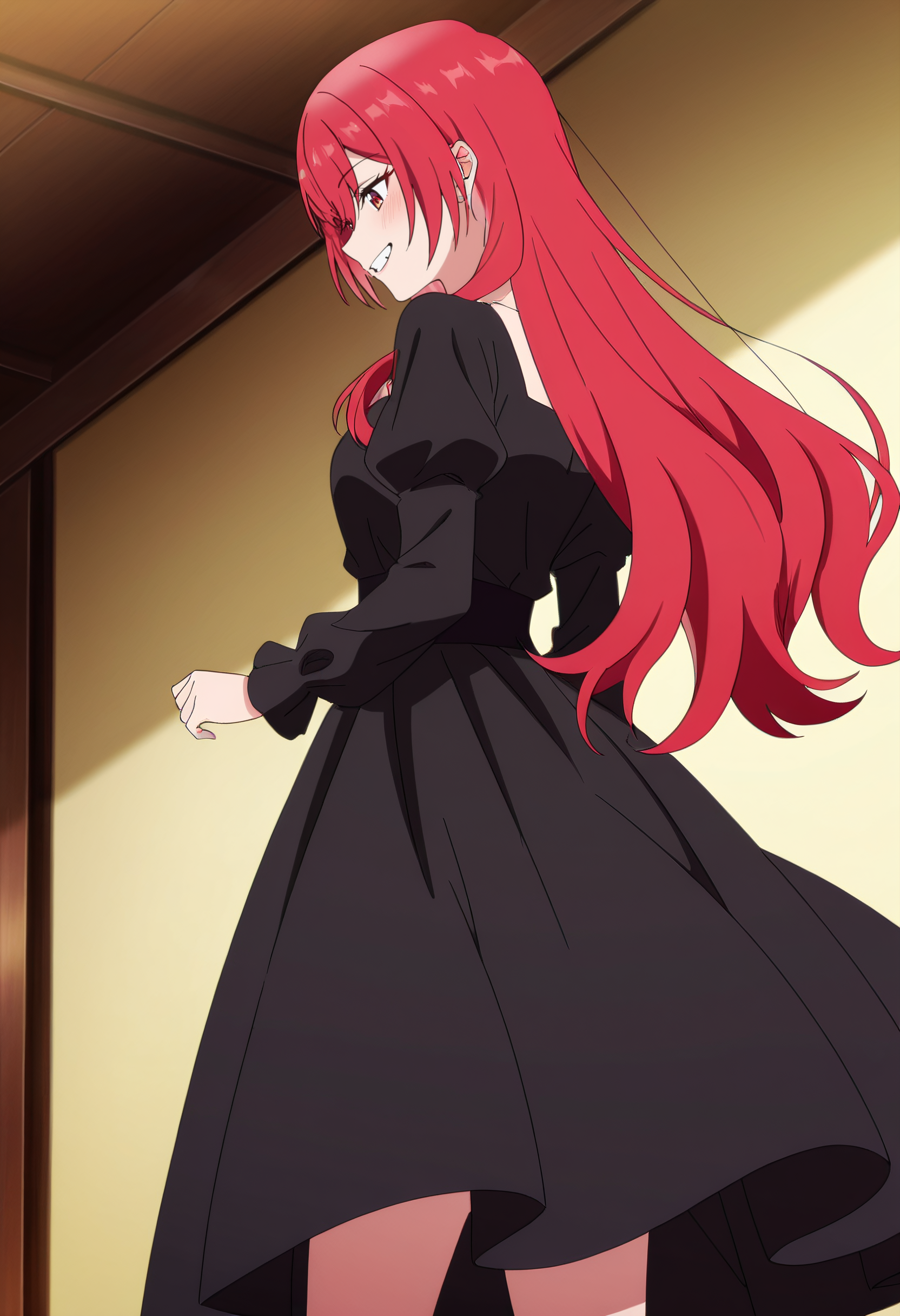DNYKureha、長い髪、赤髪、前髪、髪の間から見える眉、目と目の間に髪、赤い目、非常に長い髪