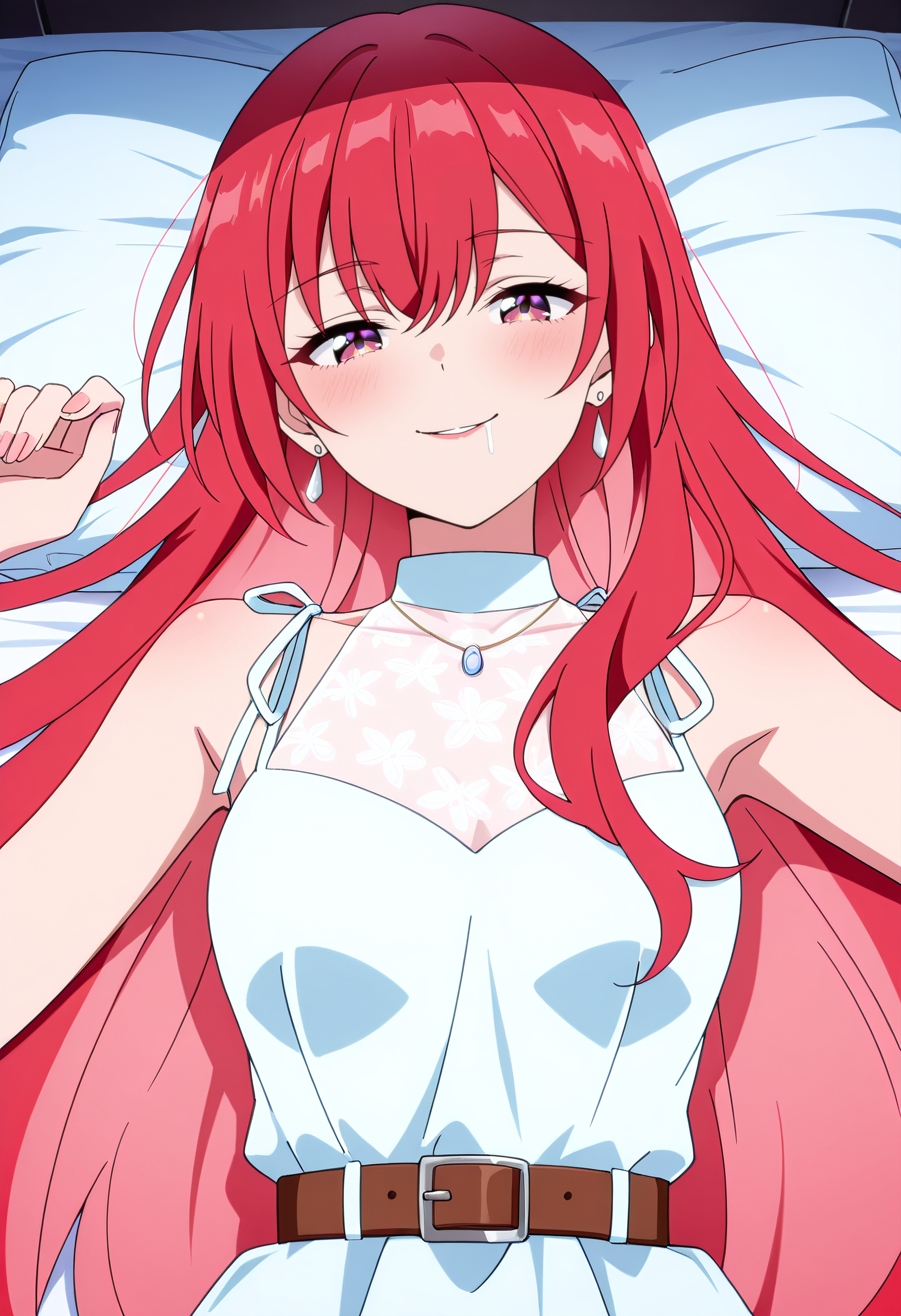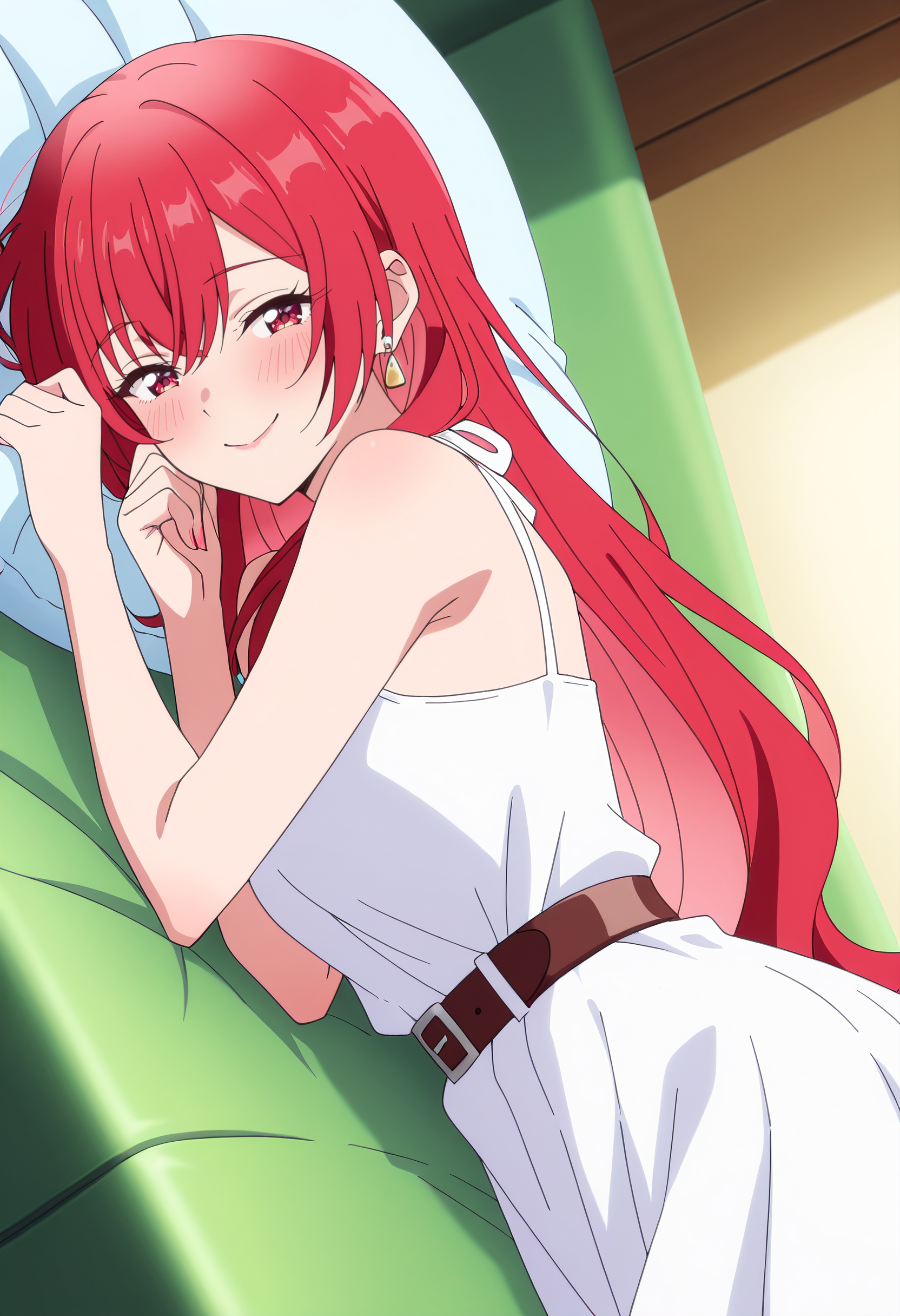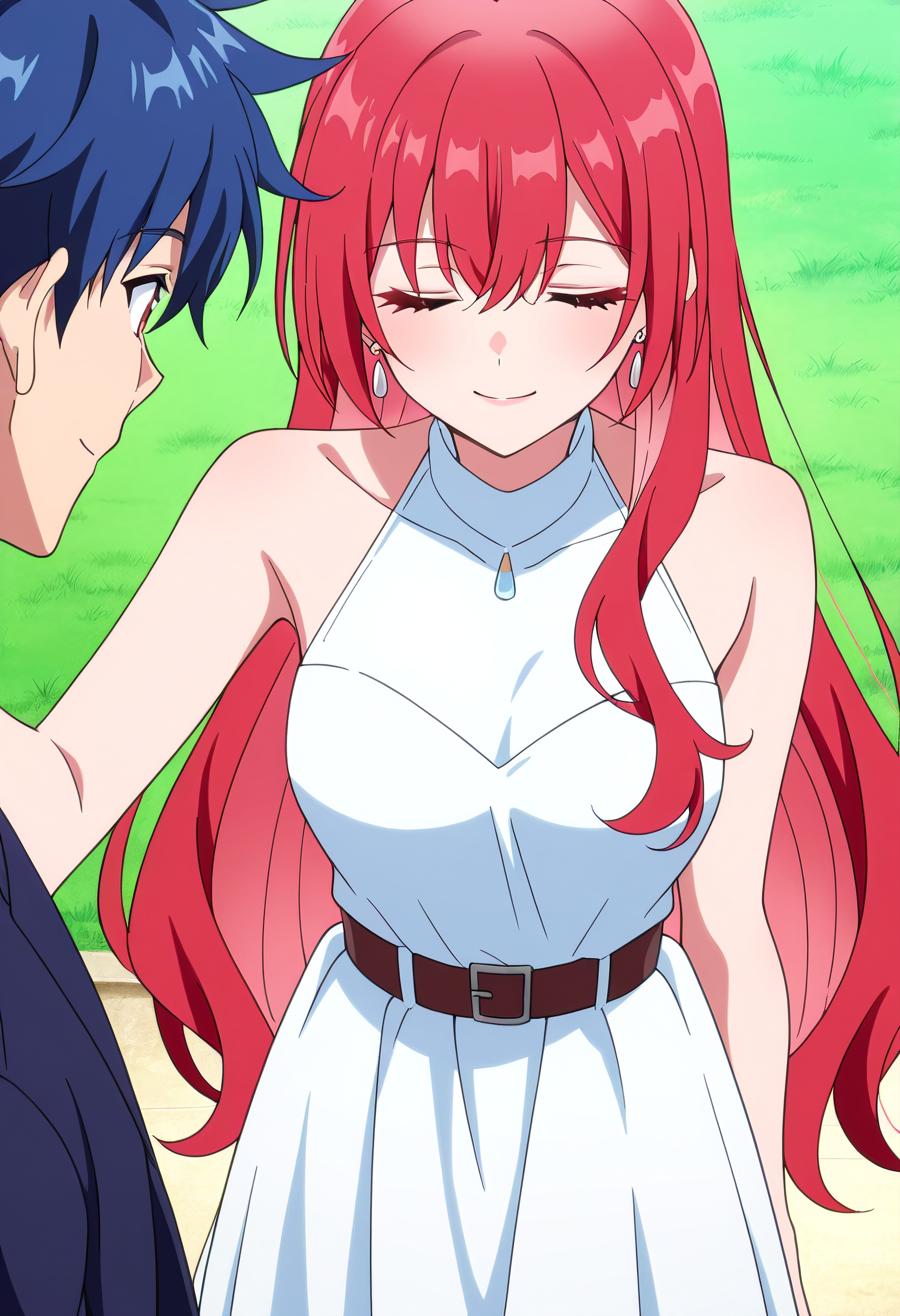 KurehaDress、ノースリーブ、肩出し、ドレス、白いドレス、ベルト、裸の腕、イヤリング、ジュエリー、ベルトのバックル、ノースリーブドレス、茶色のベルト