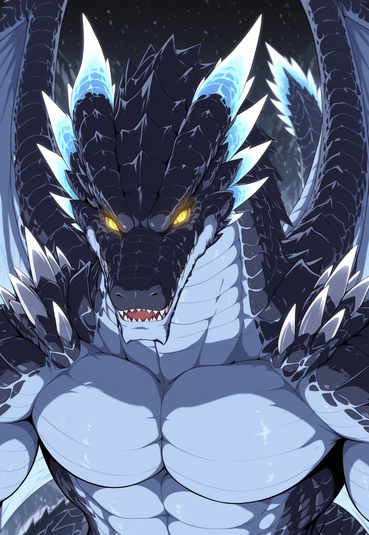 Veldora (tensura),dragón,black scales, blue chest tone, dragon horns,dragon wings,black scales,sharp teeth,glowing eyes, yellow eyes,no pupile,tail