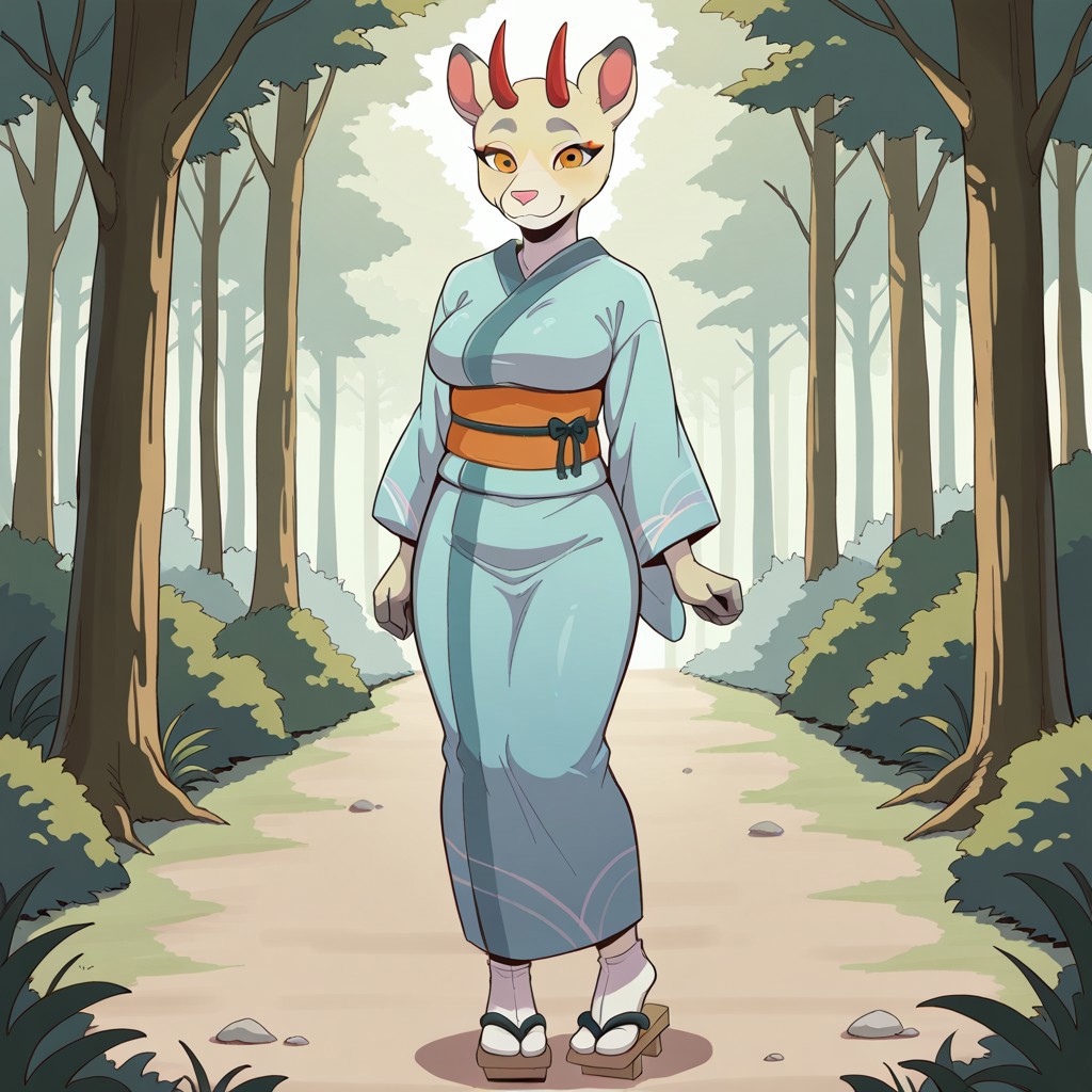 cervid, deer, cream fur, orange eyes, red horns, pink nose, black eyeliner, gray eyebrows, gray-tipped ears, medium breasts,