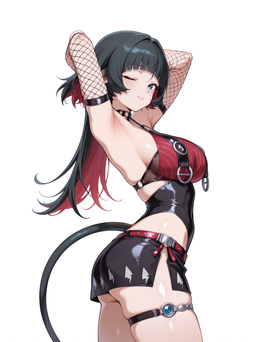 Prompts: 1girl,green eyes black hair, long hair, looking at viewer, bangs, multicolored hair, , pointy ears, bare shoulders, large breasts, animal ears, tail, leotard, red hair, nail polish, ear piercing cleavage, o-ring, miniskirt, fishnet gloves, fishnets two-tone leotard black leotard,red leotard single_thigh_strap,