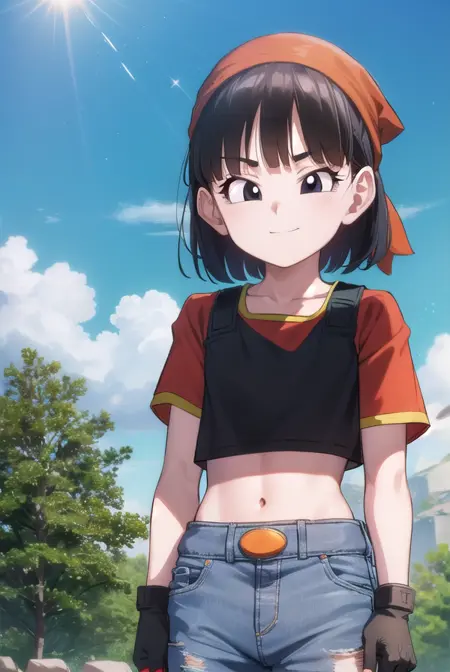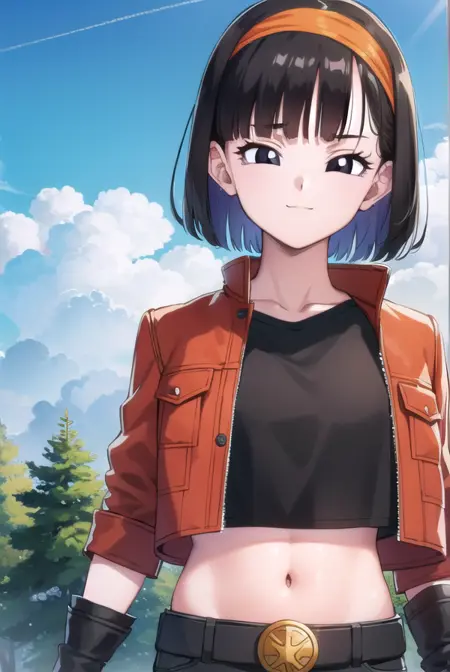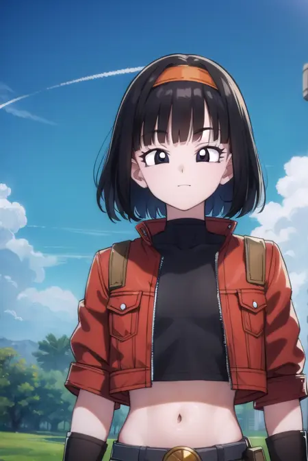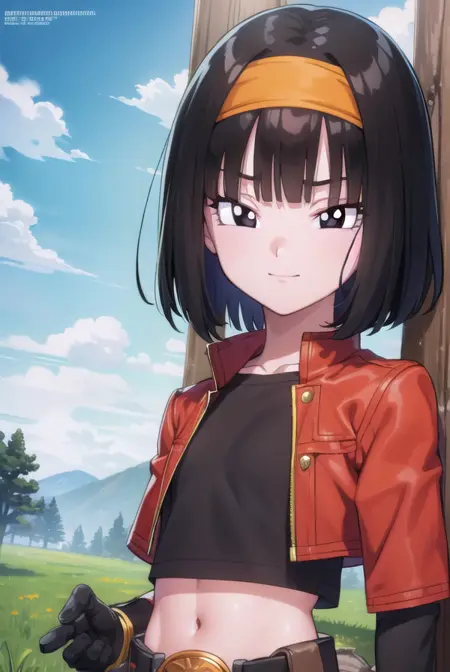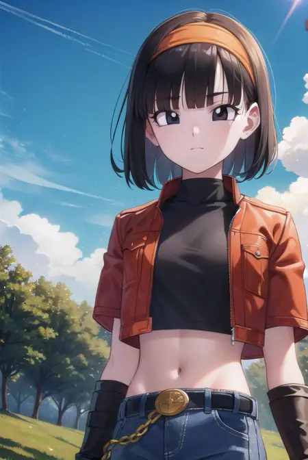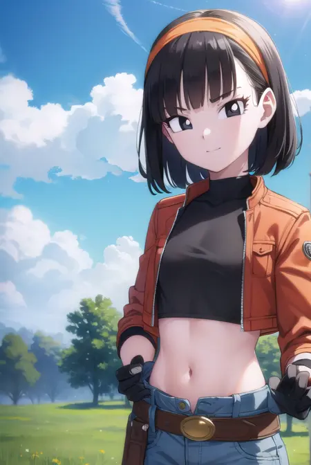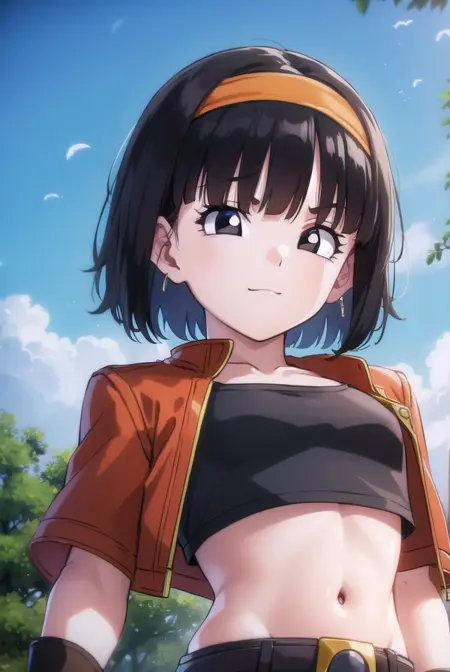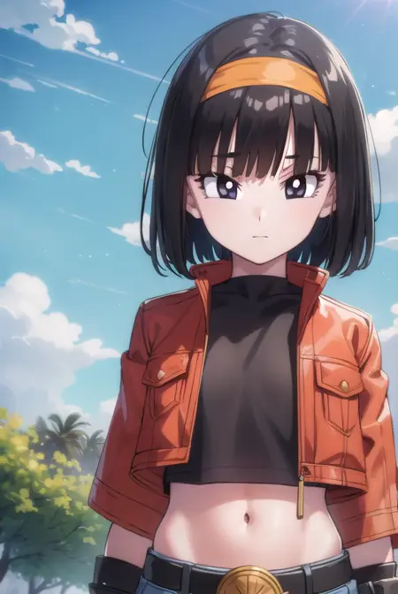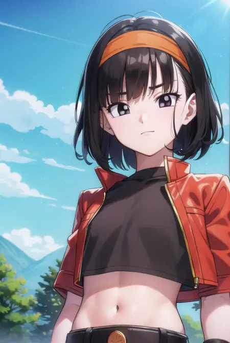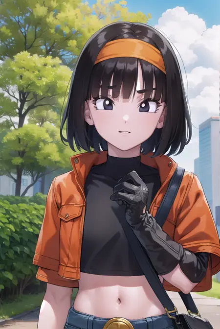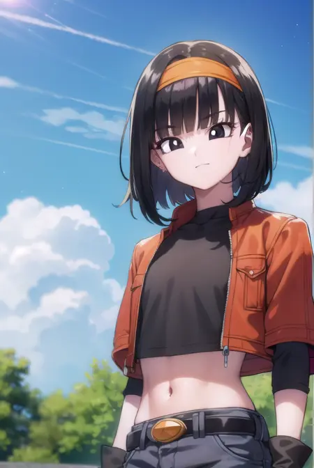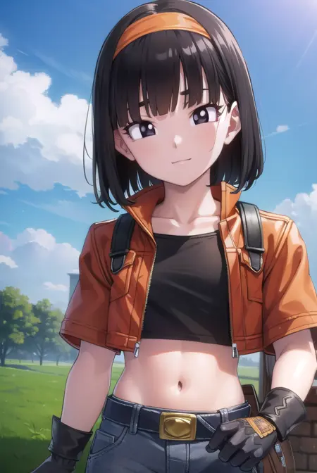 pan xeno, 짧은 머리, 앞머리, 검은 머리, 장갑, 배꼽, 재킷, 헤어밴드, 드러난 옷, 검은 장갑, 허리 부분, 벨트, 바지, 둔한 앞머리, (검은 눈:1.5), 크롭탑, 검은 셔츠, 빨간 재킷, 크롭 재킷, 주황색 헤어밴드,
