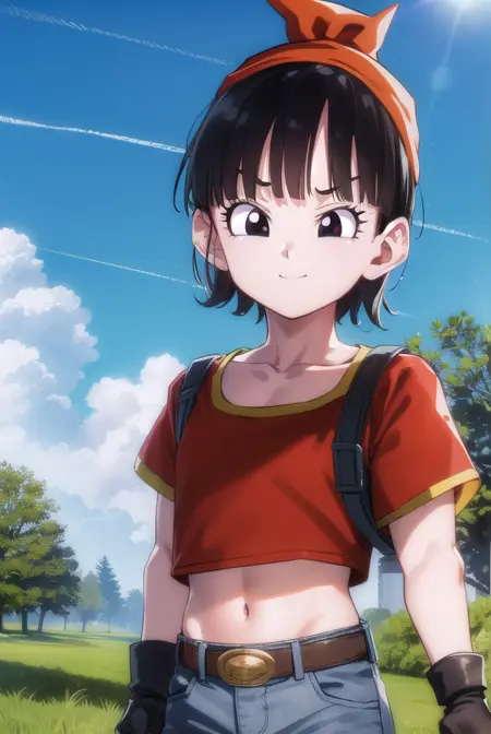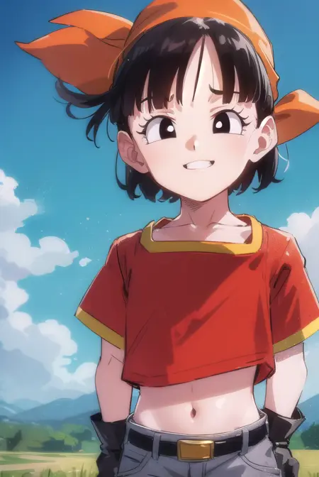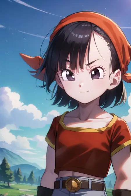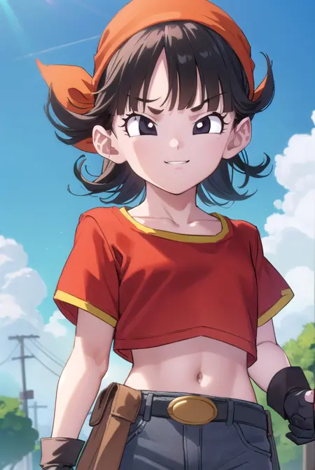 pan gt, 짧은 머리, 검은 머리, 장갑, 짧은 소매, 검은 장갑, 벨트, 바지, 손가락 없는 장갑, (검은 눈:1.5), (빨간 셔츠:1.5), 검은 벨트, 머리띠, 주황색 머리띠, 여자 아동, 회색 바지,