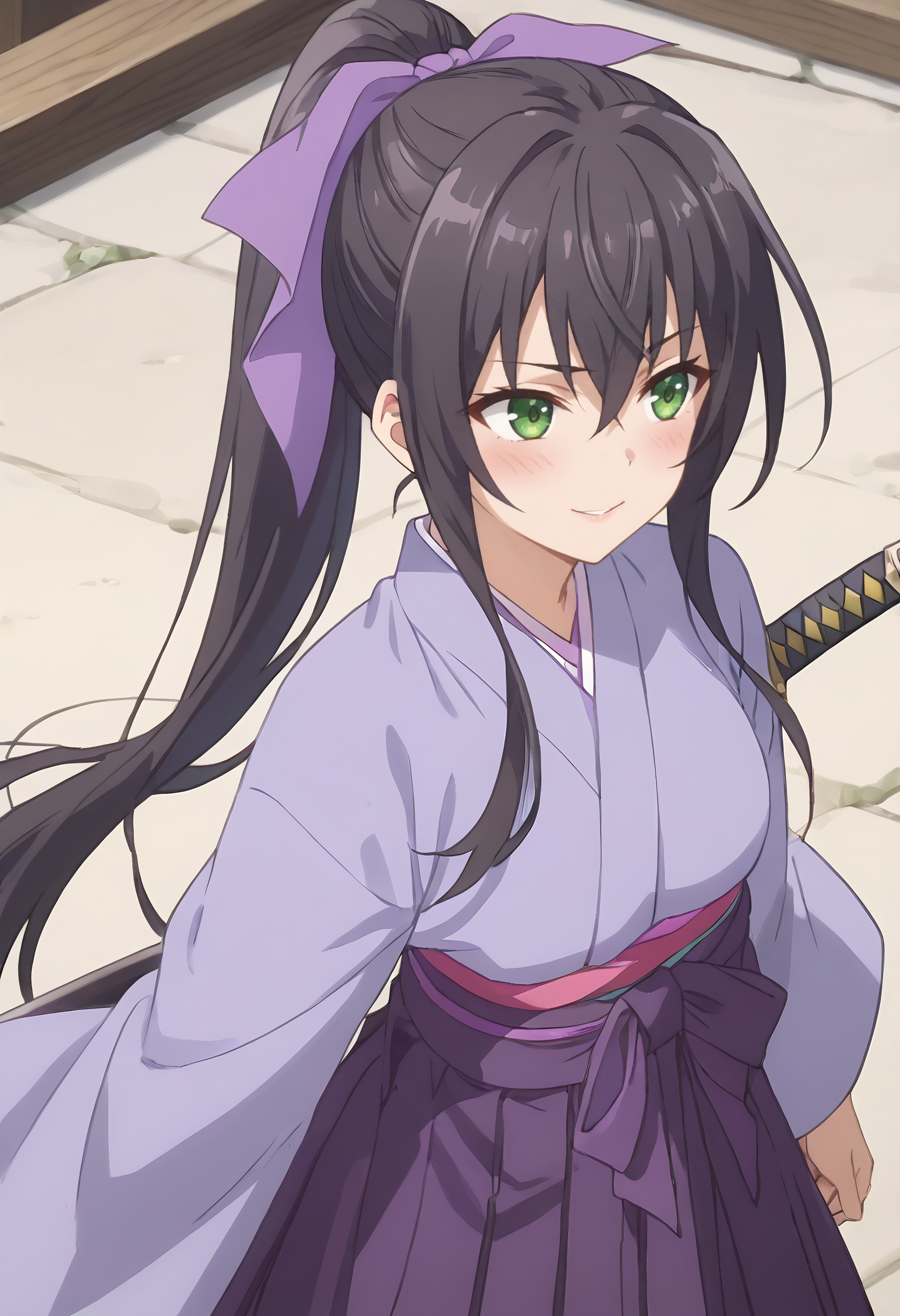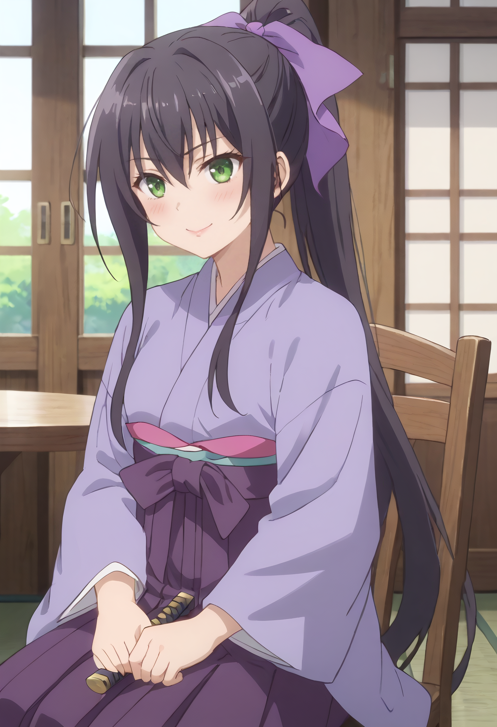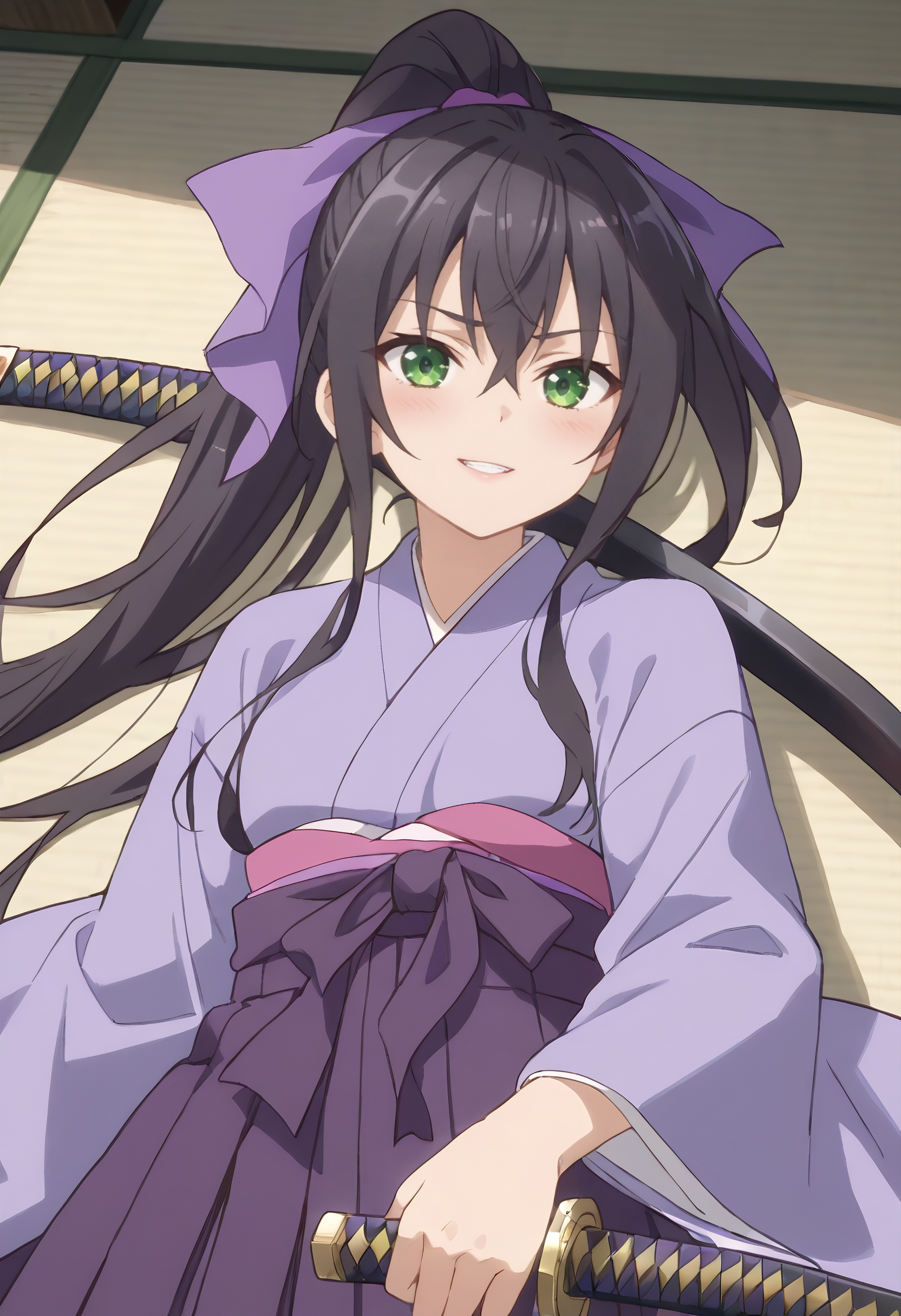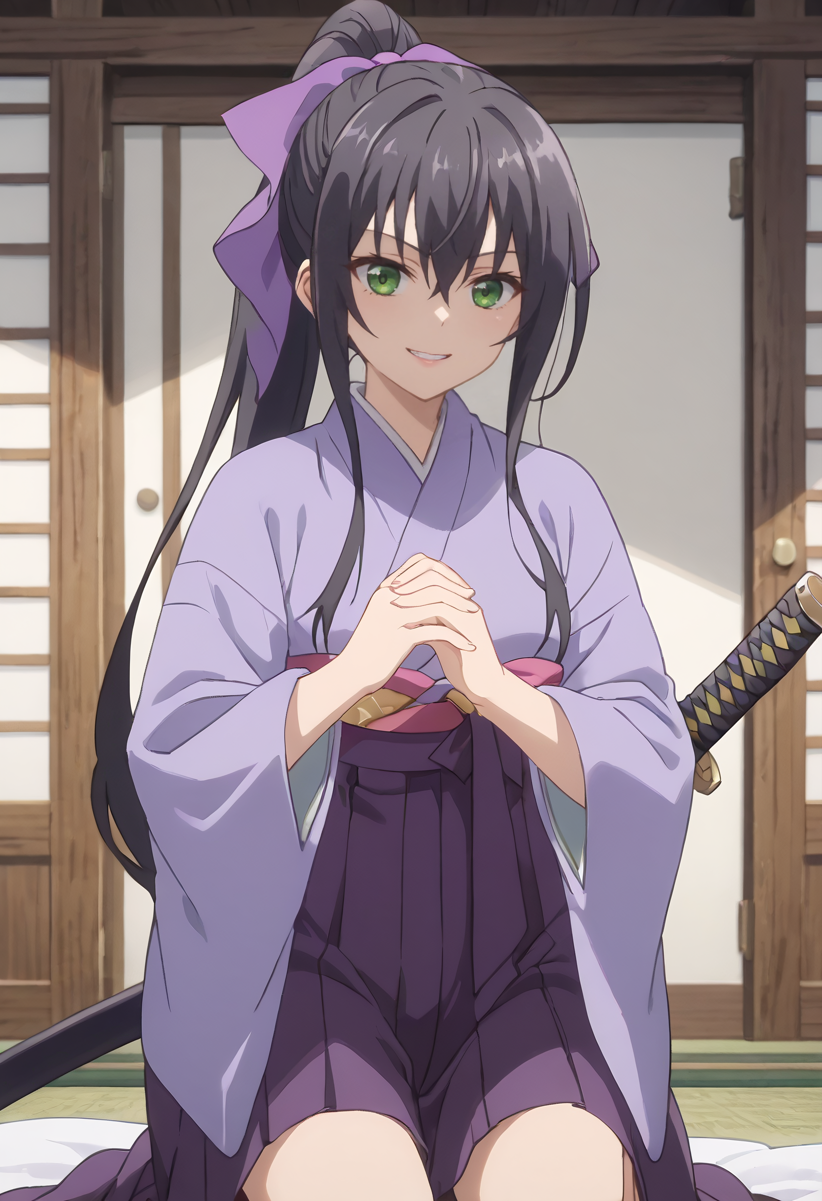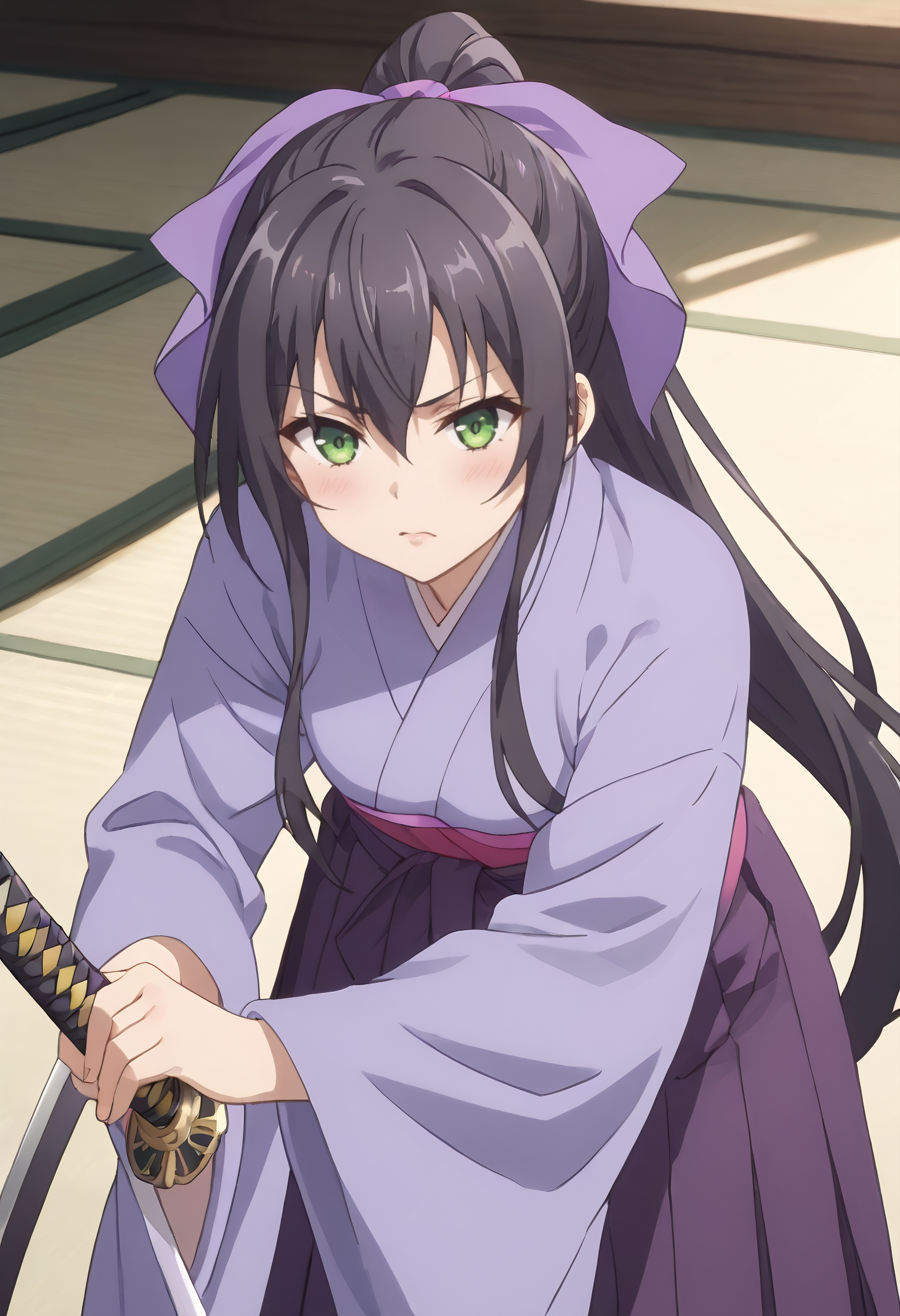 AoiKimono, 일본 옷, 기모노, 리본, 머리 리본, 긴 소매, 하카마 치마, 하카마, 치마, 넓은 소매, 보라색 리본, 보라색 기모노, 리본, 보라색 하카마, 띠,
