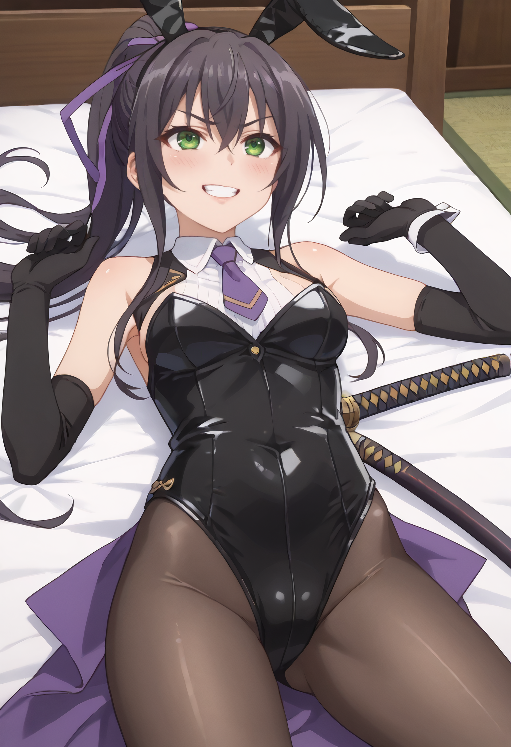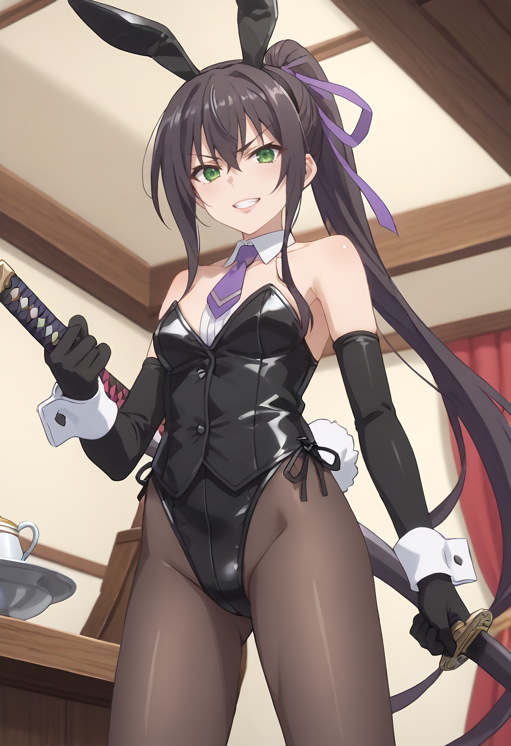 AoiBunnysuit, 동물 귀, 가상 동물 귀, 토끼 귀, 어깨 노출, 팔꿈치 장갑, 장갑, 머리 리본, 리본, 팬티스타킹, 셔츠, 레오타드, 플레이보이 버니, 보라색 넥타이, 넥타이, 흰색 셔츠, 소매 없음, 검은 장갑, 머리띠, 꼬리, 치마, 검은 레오타드, 갈색 다리 착용,