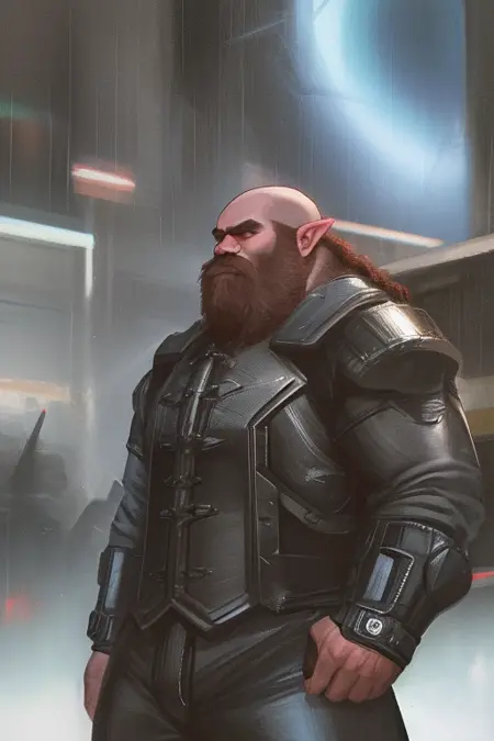 Shadowrun風ドワーフ:ポジティブプロンプトに「dwarf, short, stocky, broad shoulders, pointy ears」を追加。ネガティブプロンプトに「furry, pointy ears, elf ears, dwarf ears, cat ears, horns, tusks」を追加。モデルによっては重みの調整を試みてください。