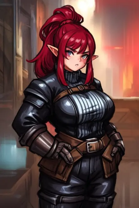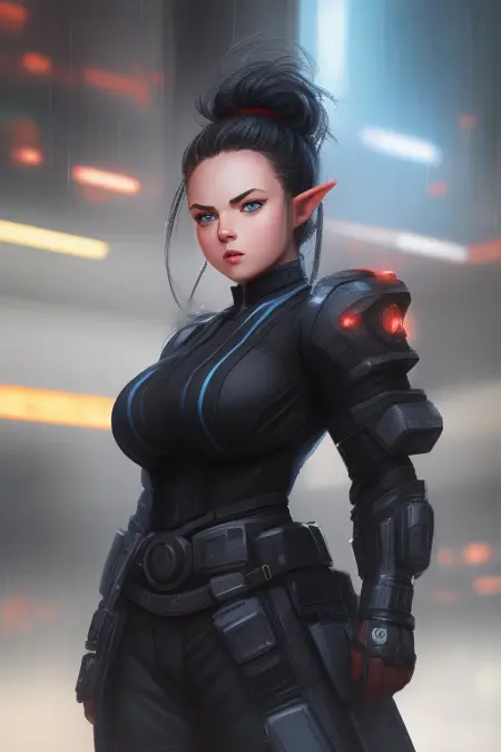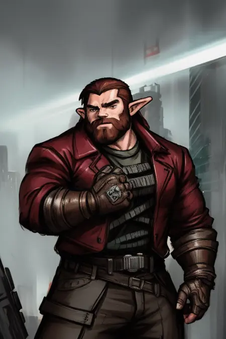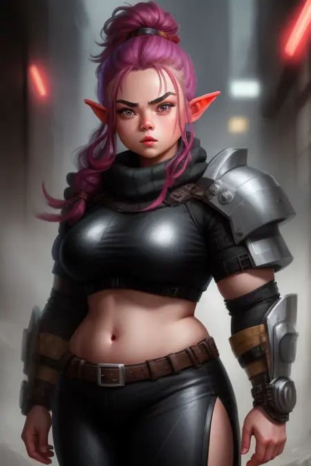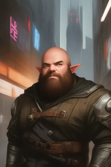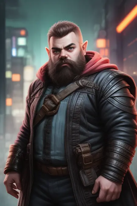 1)赛博朋克式矮人:在正面提示中加入“矮人、矮小、健壮、宽肩、尖耳朵”,在负面提示中加入“毛茸茸、尖耳朵、精灵耳、矮人耳、猫耳、角、獠牙”。根据具体模型调整权重。