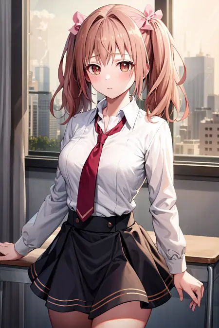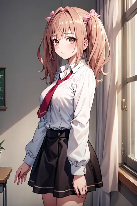 ((best quality, high quality, masterpiece, highres)), noa akizuki, 1girl, solo, looking at viewer, school uniform, white shirt, red necktie, bow, school, classroom, cowboy shot, skirt