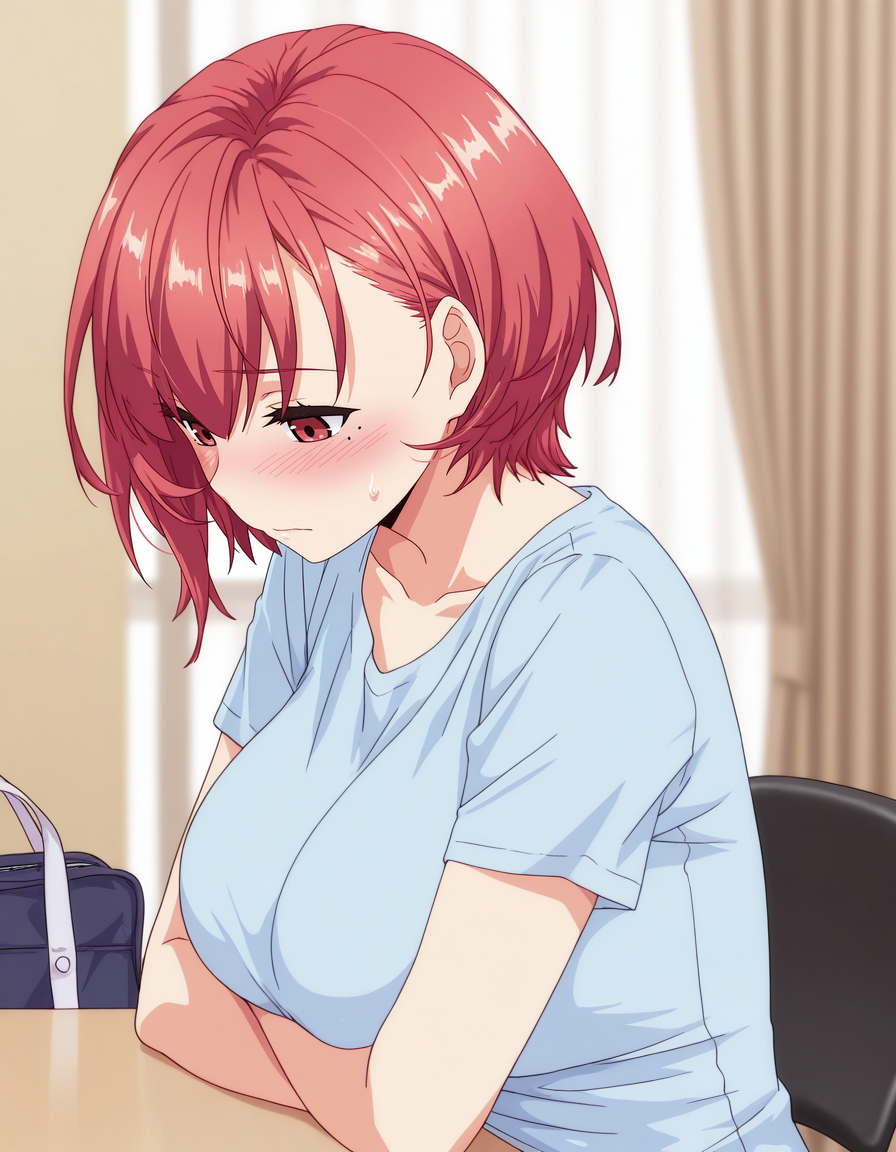 mai_mta,mai_kurumimt,short_hair,red_hair,red_eyes,mole_under_eye,large_breasts,yellow_shirt,belt,pencil_skirt,blue_skirt,black_footwear,pink_bow,footwear_bow,shoulder_bag