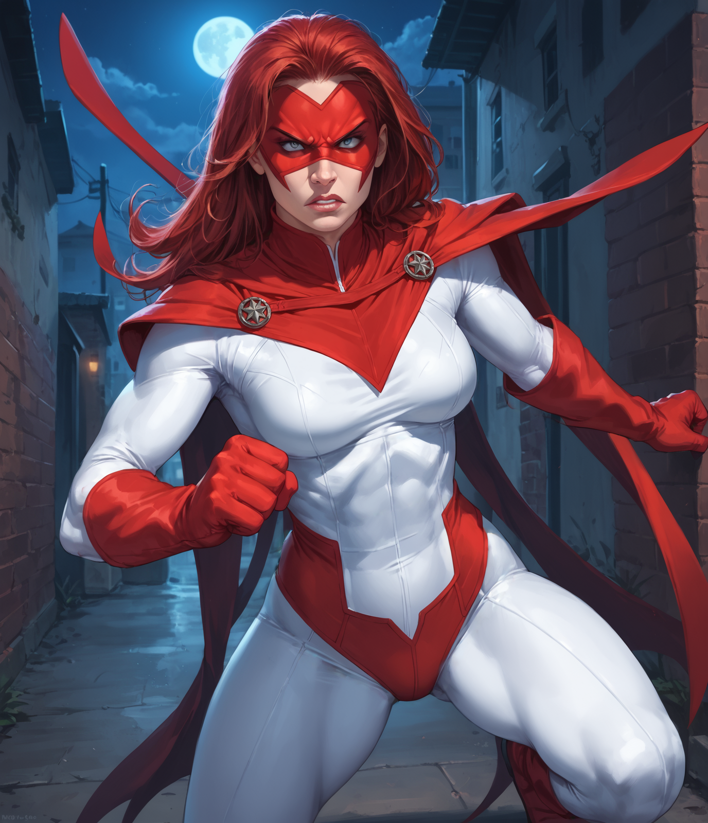 1girl, solo, long hair, red hair, red mask, red cape, red gloves, red boots, white bodysuit