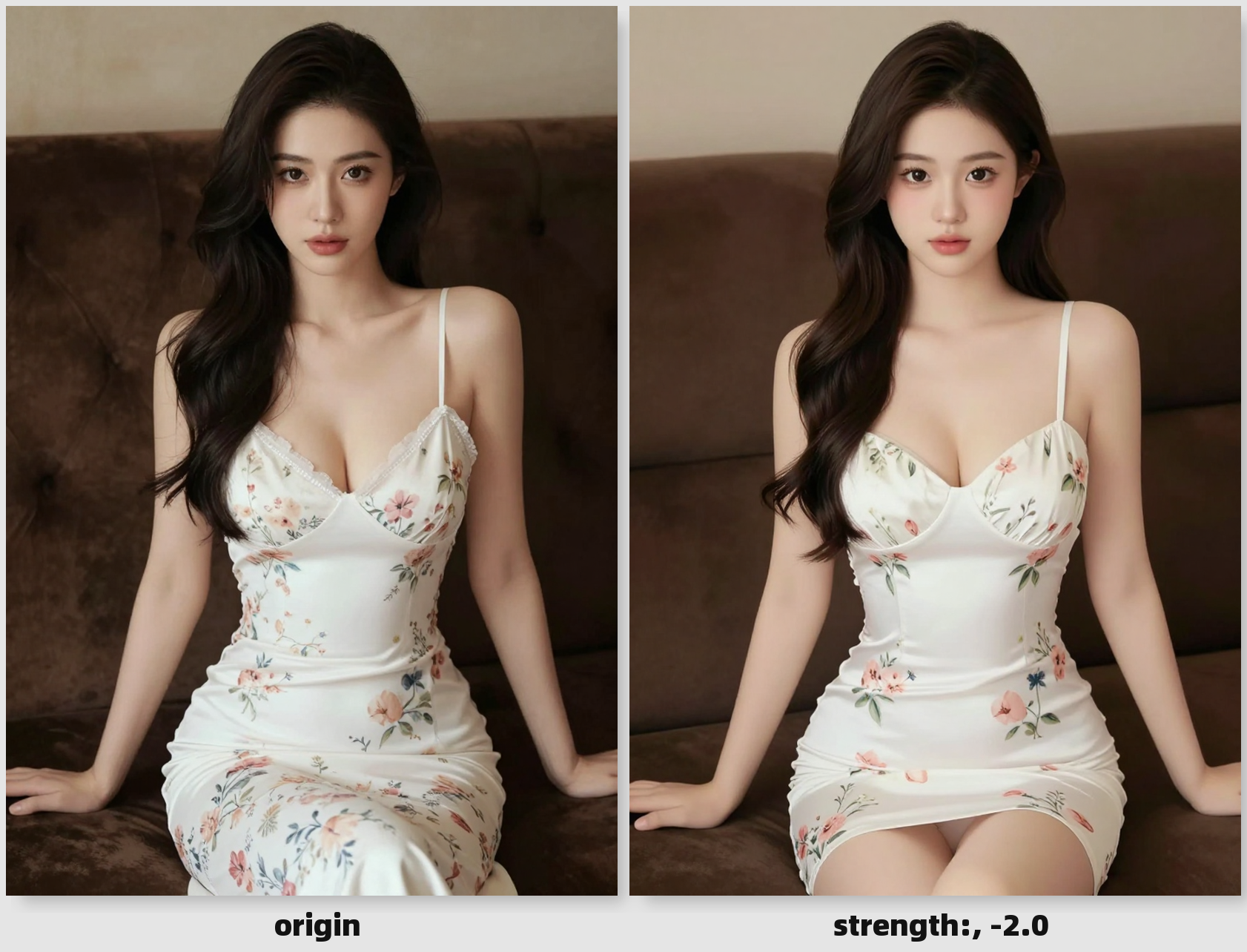 a woman seated in a plush. She wears a white, floral-patterned, low-cut dress. portrait realistic