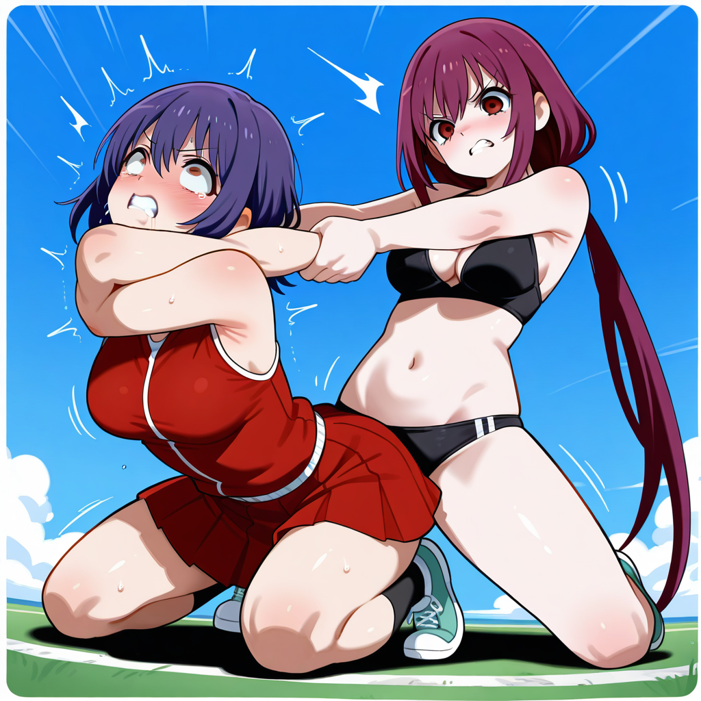 gokuraku_gatame, ryona, strangling, pain, asphyxiation, crossed arms, grabbing another's both arm, arm grab, pulling arm, 1girl, 1boy, behind back, kneeling, sitting