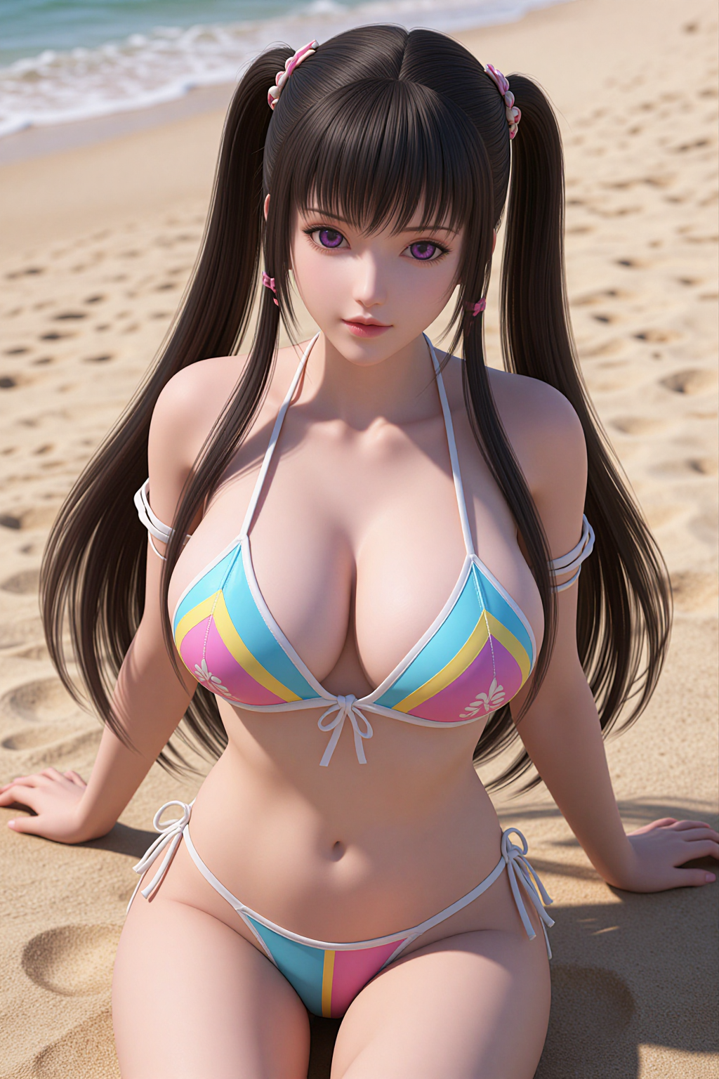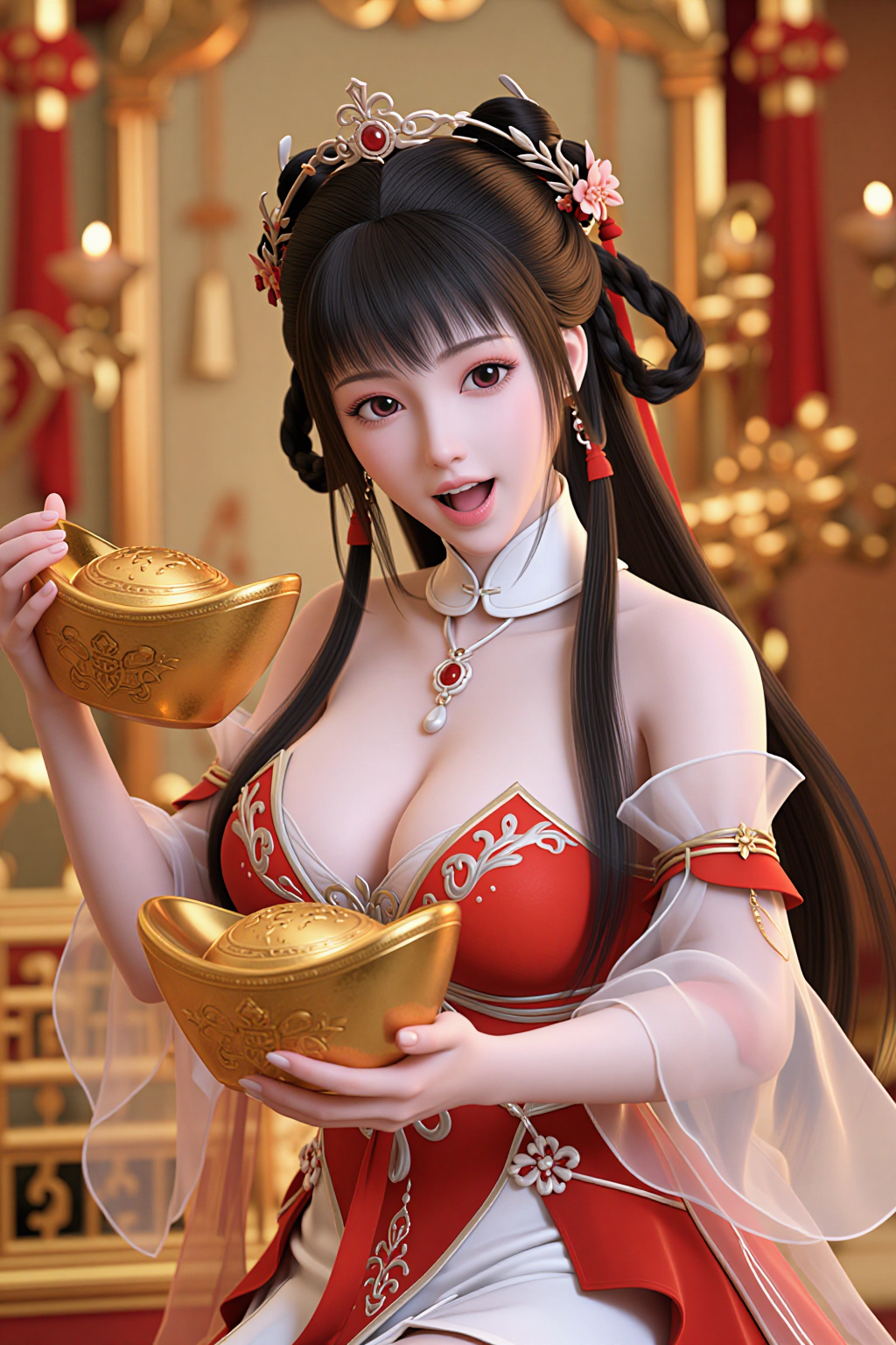 1girl, solo, hair ornament, hair rings, black hair, flower, upper body, branch, braid, hair flower, red dress, bare shoulders, long hair, purple eyes, hands on hips, realistic