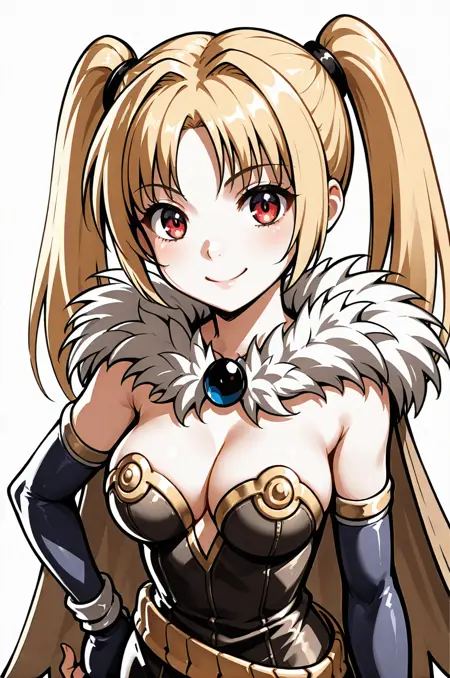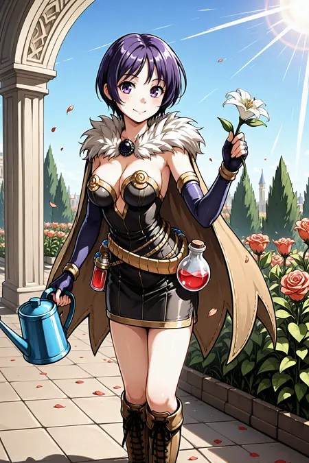 プロンプト: alchemyRO, belt, cape, cleavage, fingerless gloves, fur trim, skirt, strapless, knee boots