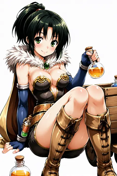 Prompt: alchemyRO, belt, cape, cleavage, fingerless gloves, fur trim, skirt, strapless, knee boots
