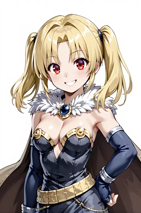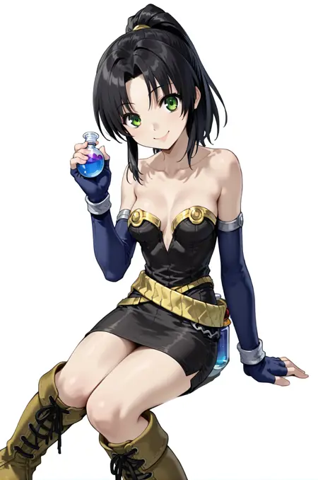 Prompt: alchemyRO, belt, cape, cleavage, fingerless gloves, fur trim, skirt, strapless, knee boots