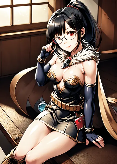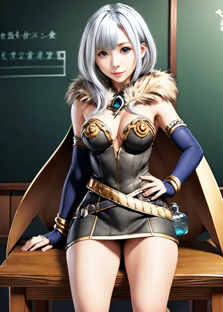 提示词: alchemyRO,腰带,披风,露胸,无指手套,毛皮镶边,裙子,无肩带,及膝靴