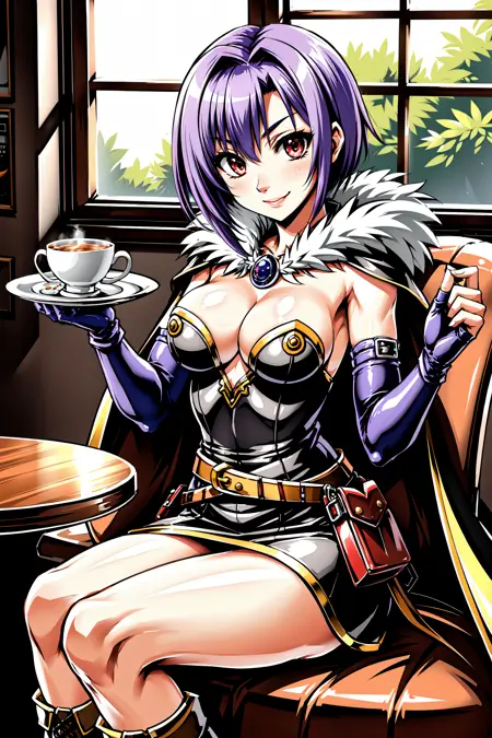 プロンプト: alchemyRO、ベルト、マント、乳首の露出、指なし手袋、ファー縁、スカート、ストラップレス、膝丈ブーツ