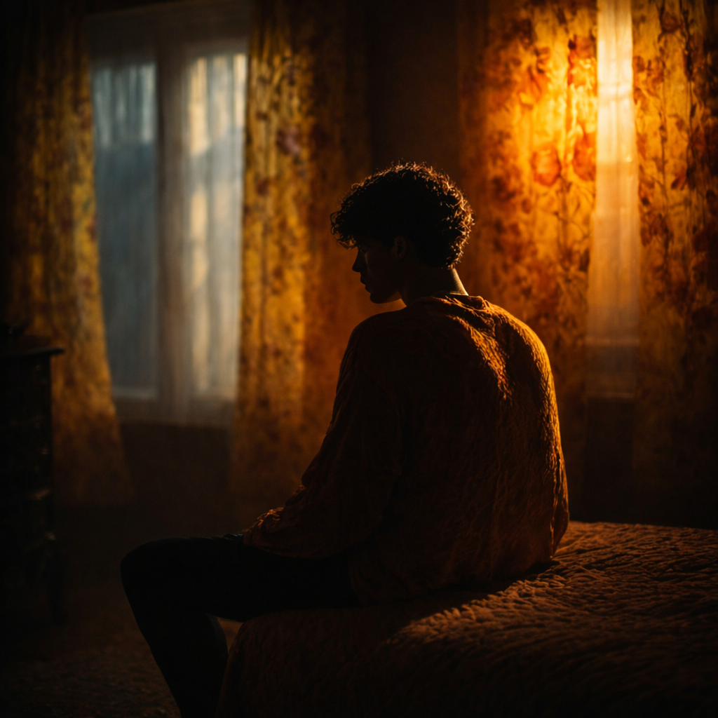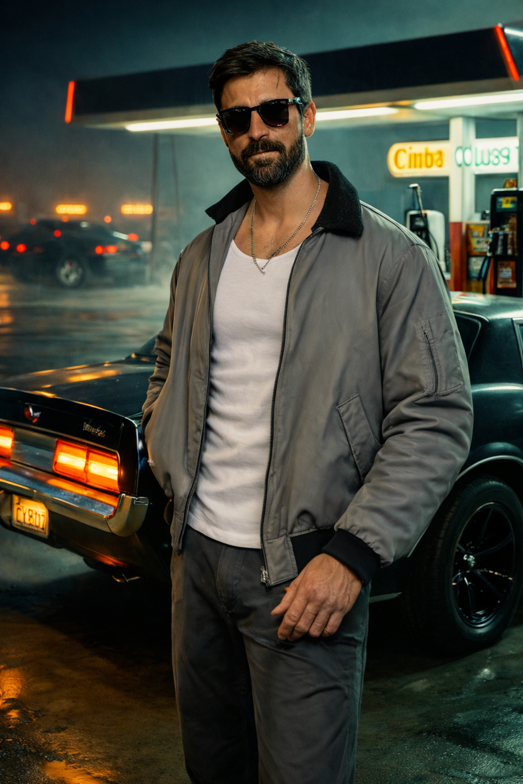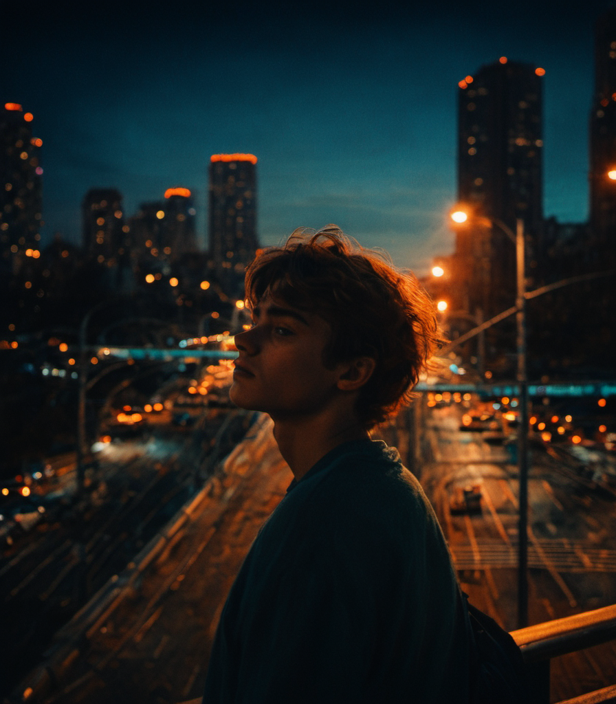 シネマティックで映画のような夜景ポートレート。若者が橋の上に身を乗り出し、静かで内省的な表情でカメラを振り返っている。街の光が背後に輝き、ドラマチックで明るく鮮やかなオレンジ色の街灯が teal-blue の夜空と深い影と強く対比する。ソフトなボケ、浅い被写界深度、控えめなアナロググレインが、CinneM3n のスタイルで、ムーディーでノスタルジックなほぼ35mmフィルムのような美しさを生み出している。