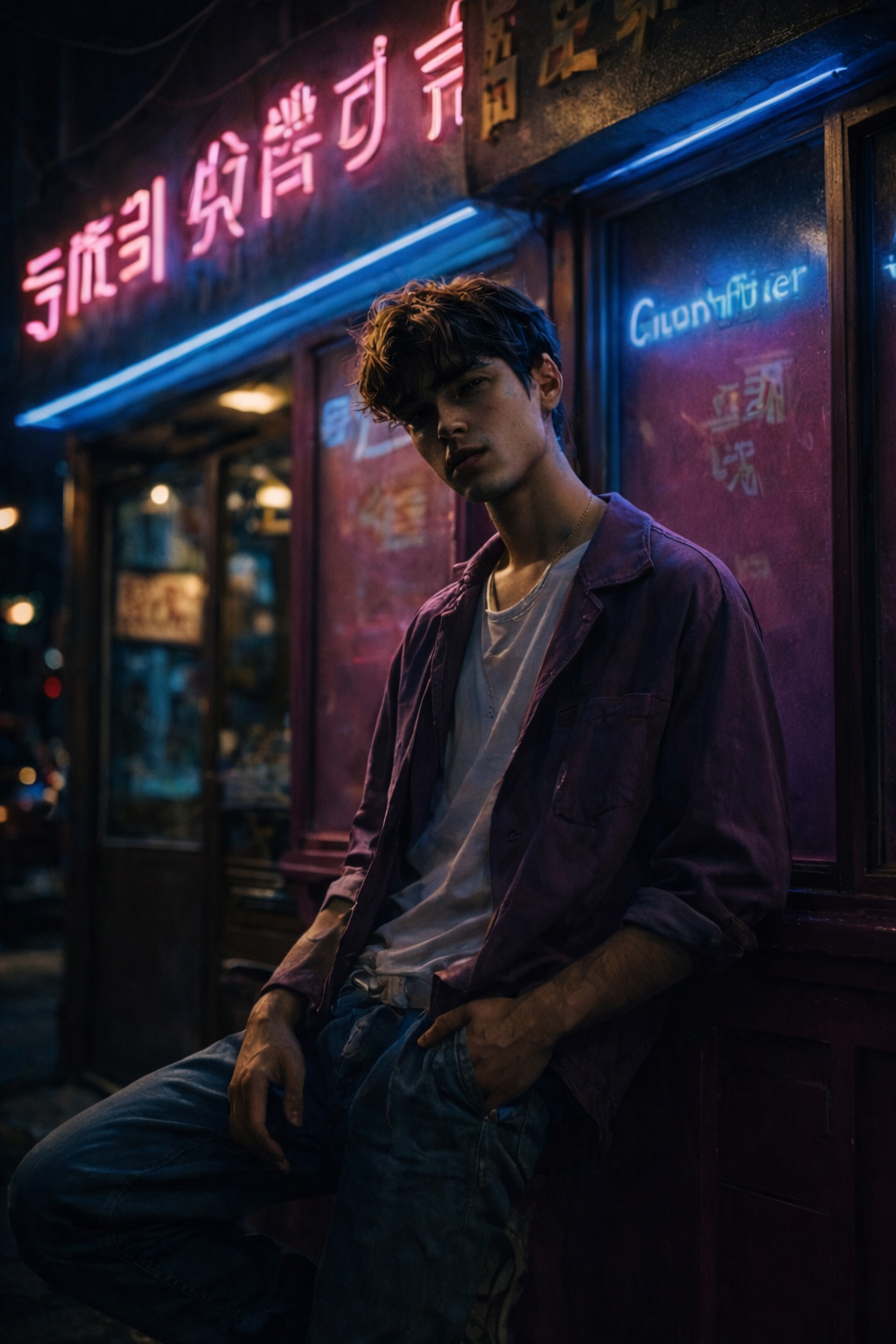 一幅电影感十足的夜间肖像,展现一位年轻人倚靠在桥边,回头凝视镜头,表情宁静而内省,城市在身后熠熠生辉。戏剧性的明亮橙色街灯与青蓝色夜空及深邃阴影形成鲜明对比,柔和的景深虚化、浅景深与细微的模拟颗粒感,赋予画面一种忧郁怀旧、近乎35毫米胶片的美学风格,风格参考 CinneM3n。