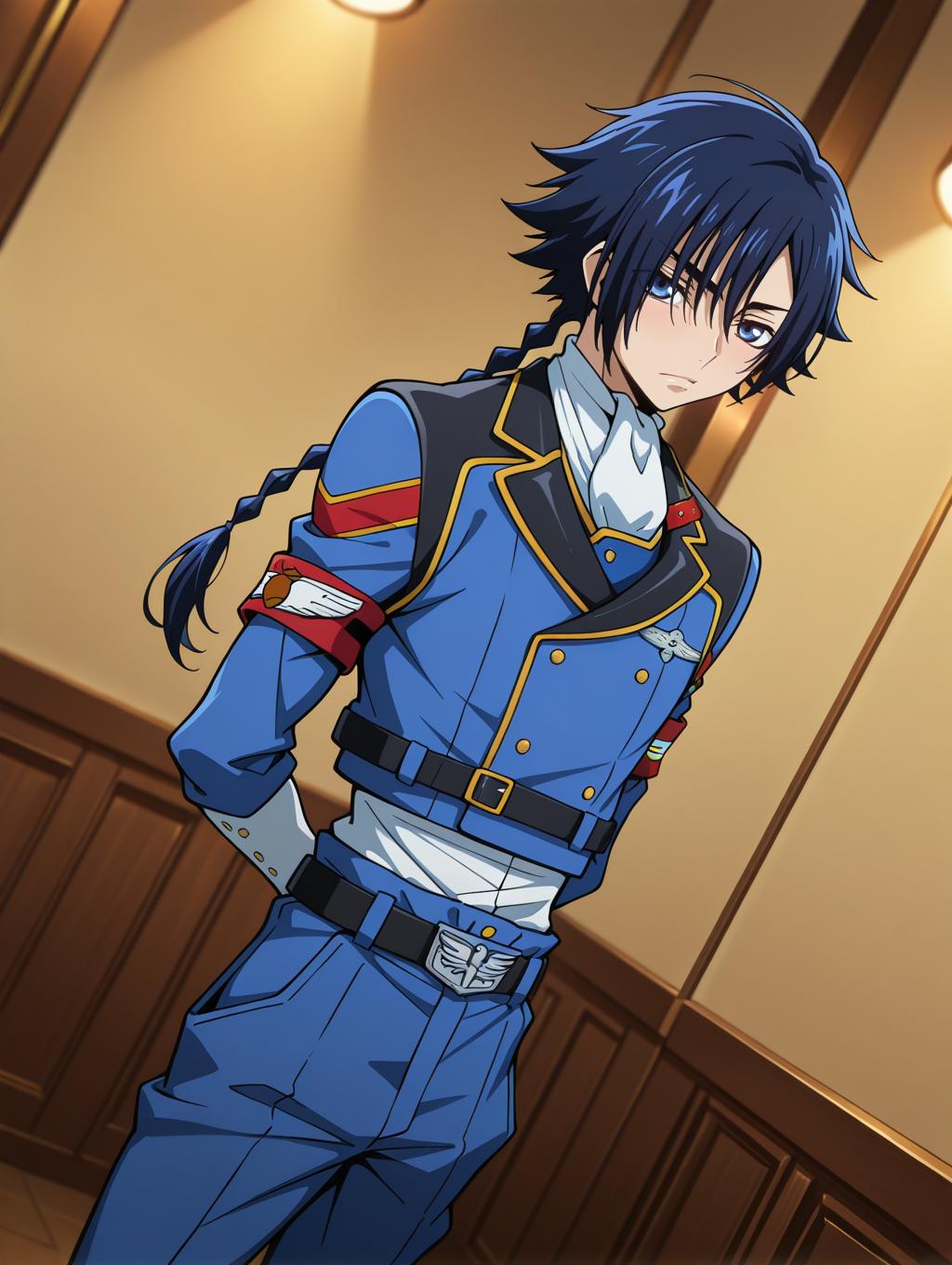 military uniform, ascot, blue jacket, blue pants