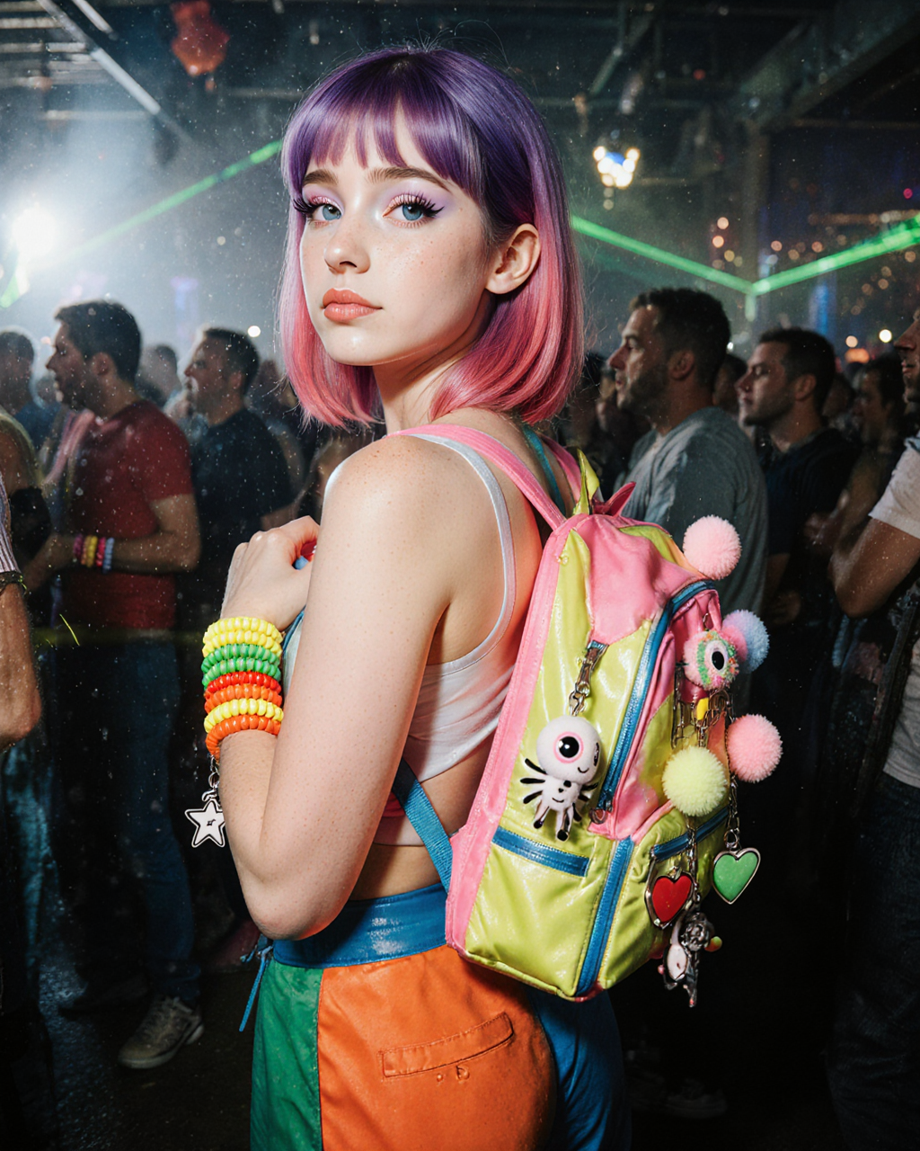 모든 흐릿하고 네온빛으로 가득 찬 90년대 중후반 사탕 레이버의 광란. 이 LoRA는 액세서리와 옷차림에서 특히 빛난다: 끝없이 쌓인 캔디 팔찌, 두꺼운 층을 이룬 구슬 목걸이, 핀으로 뒤덮인 배낭, 그리고 넓고 타이트한 레이브 옷차림.