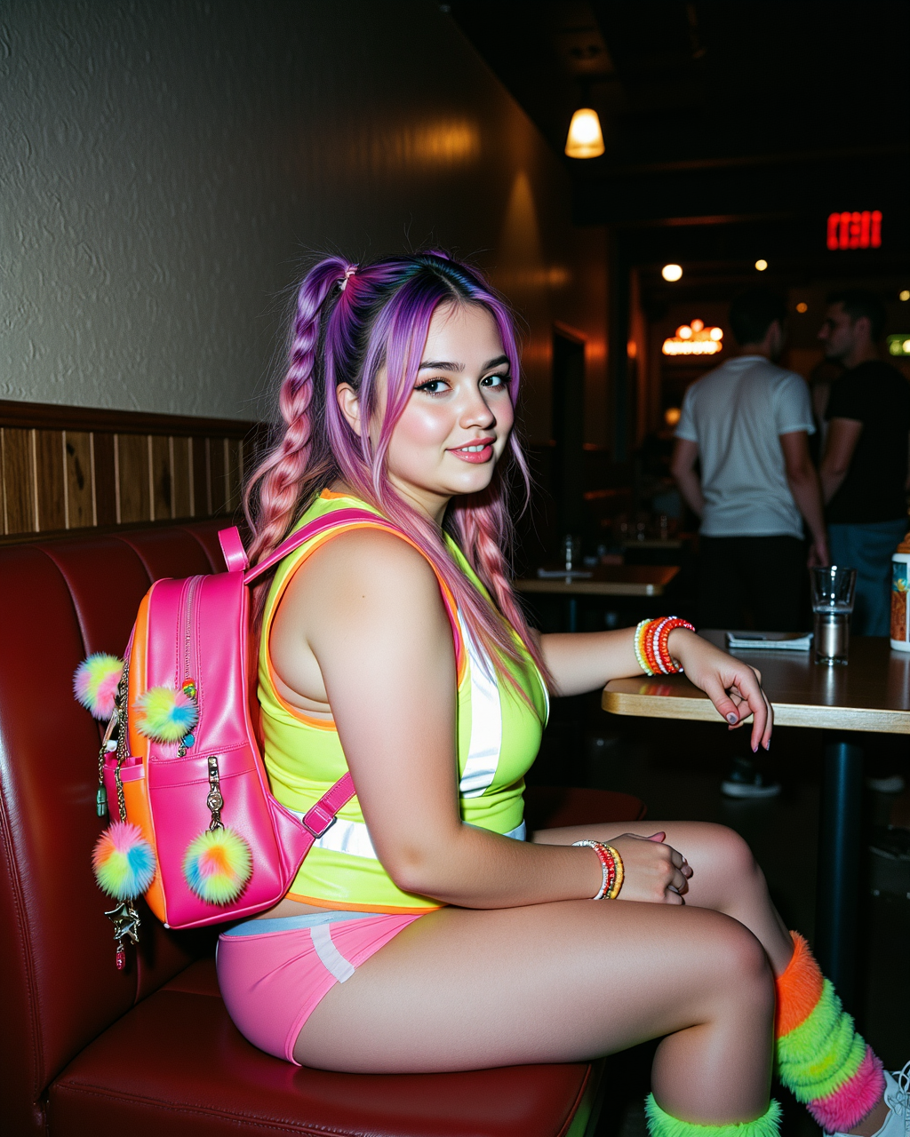 c4ndy, 크로스 프로세스 슬라이드 필름 분위기, 19세로 마른 몸매의 사탕 레이버 소녀, 네온 핑크, 노랑, 주황, 녹색으로 된 밝은 색상의 배낭, 퍼 펌퐁, 미니 플러시 열쇠고리, 하트 장식, 별 장식 등 귀여운 액세서리, 네온 색상의 밝은 운동화를 신고, 쓰레기로 뒤덮인 벤치에 앉아, 더럽고 쓰레기로 넘쳐나는 공중 화장실 스타일에서, 광택 나는 네온 라텍스 크롭과 마이크로 반바지를 입고, 층층이 쌓인 캔디 팔찌, 사탕 레이버 최고의 미학, 밤늦은 즐거움 분위기, 큰 행복한 미소, 강렬한 천장 형광등