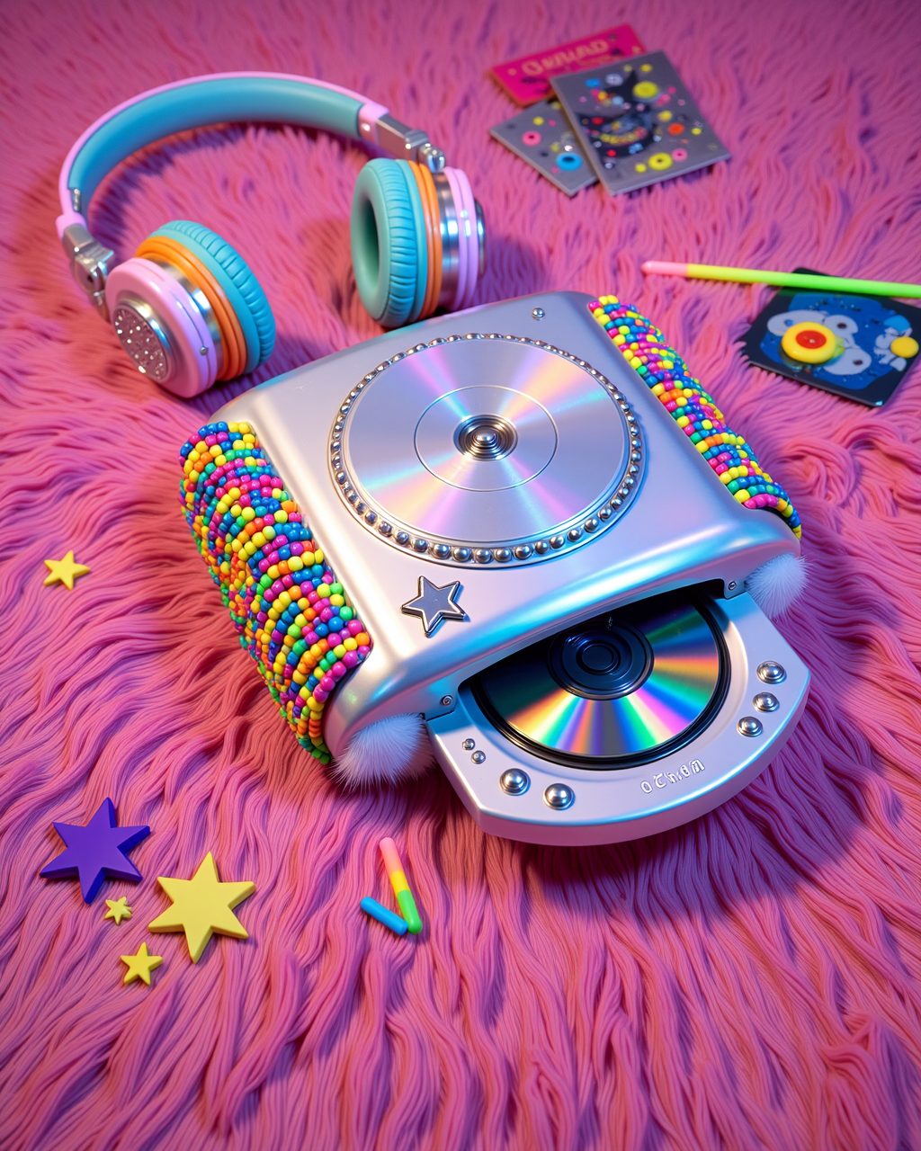 c4ndy, 게임보이 컬러 콘솔이 사탕 레이버 스타일로 변형되어 테이블 위에 놓임